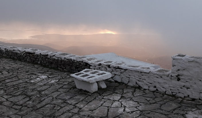 Πυκνή ομίχλη, βαριά σύννεφα που κρύβουν το τοπίο, περιορισμένη ορατότητα και κλειστός ορίζοντας, στοιχεία που μοιάζουν περισσότερο με σκηνή από ορεινό προορισμό της ηπειρωτικής χώρας, αντίκριζε κανείς ως θέα πρόσφατα από το πιο ψηλό σημείο του νησιού τους Αγ. Πάντες.
