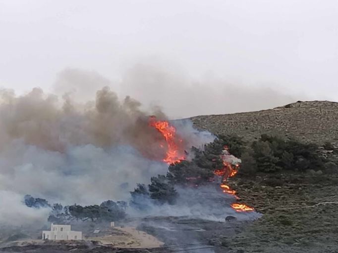 Η πυρκαγιά καίει χορτολιβαδική έκταση στο δρόμο προς Μαράθι, σε απόσταση μερικών χιλιομέτρων από την Παροικιά.