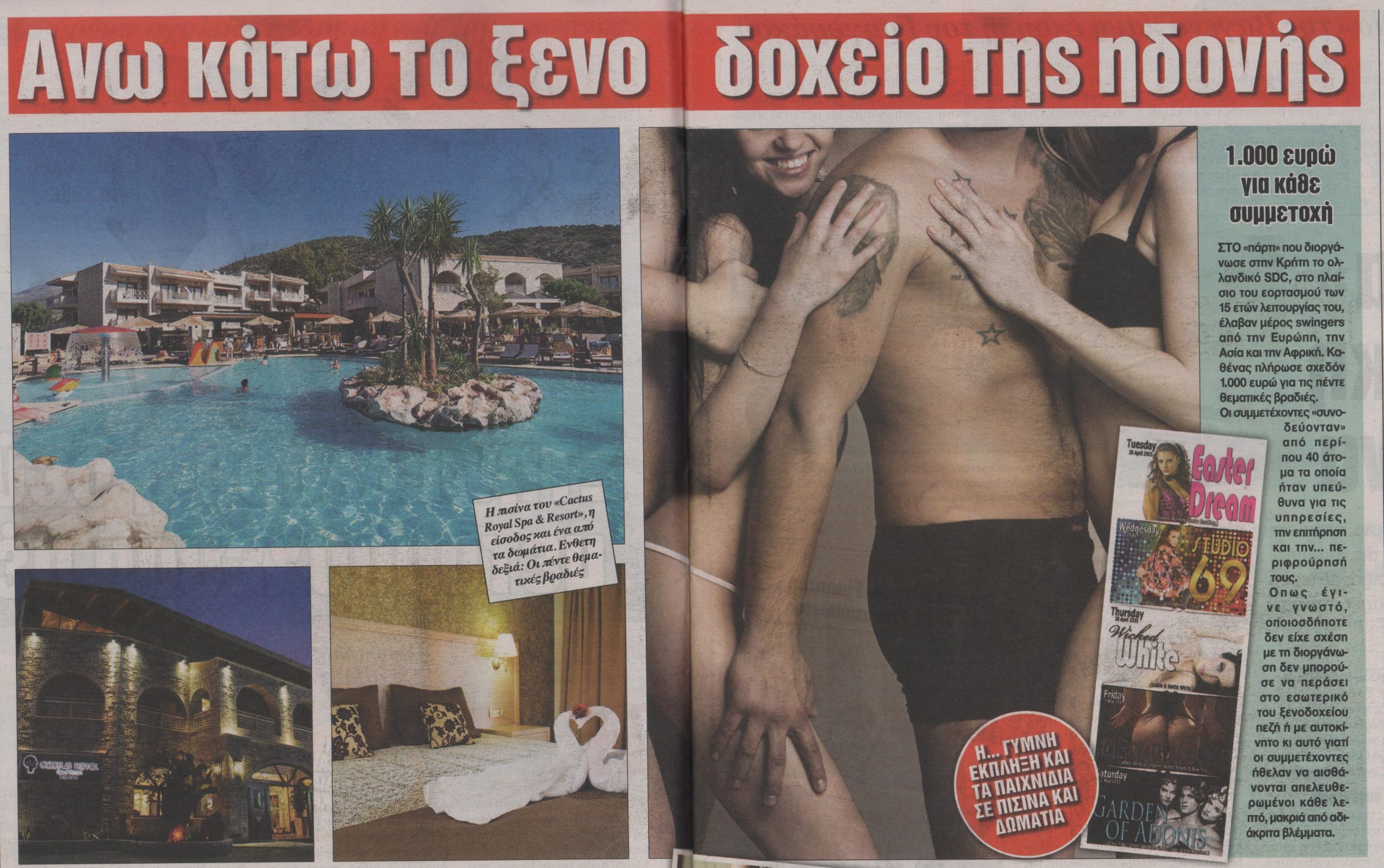 177 ζευγάρια, σύμφωνα με την εφημερίδα “Εspresso”, πέρασαν πέντε νύχτες ακολασίας στο χλιδάτο «Cactus Royal Spa & Resort» στη Σταλίδα, το οποίο μετατράπηκε σε φρούριο από τις 28 Απριλίου έως και χθες, Κυριακή, οπότε και αναχώρησαν -όπως ήταν προγραμματισμένο- οι swingers.