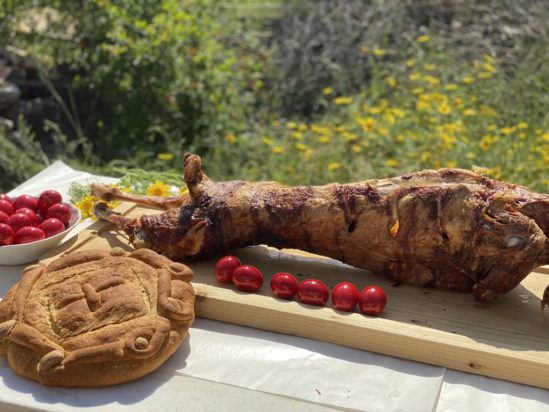 Το αρνί μπήκε στη σούβλα από νωρίς το πρωί, από τον ψήστη που κάνει αυτή τη δουλειά εδώ και πενήντα χρόνια και έχει τα μυστικά της τέχνης του, το κρασί ρέει άφθονο, ενώ το κέφι περισσεύει.