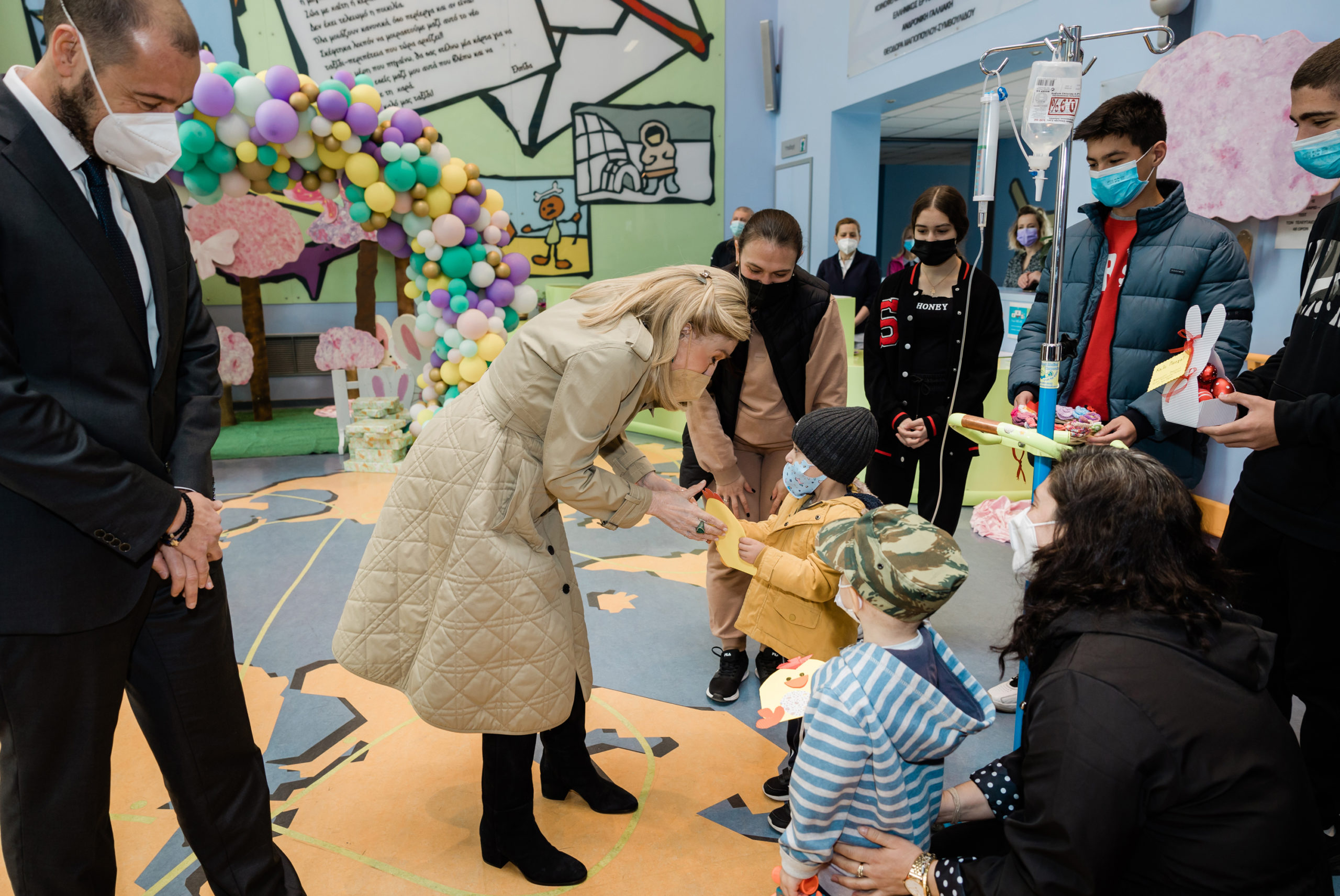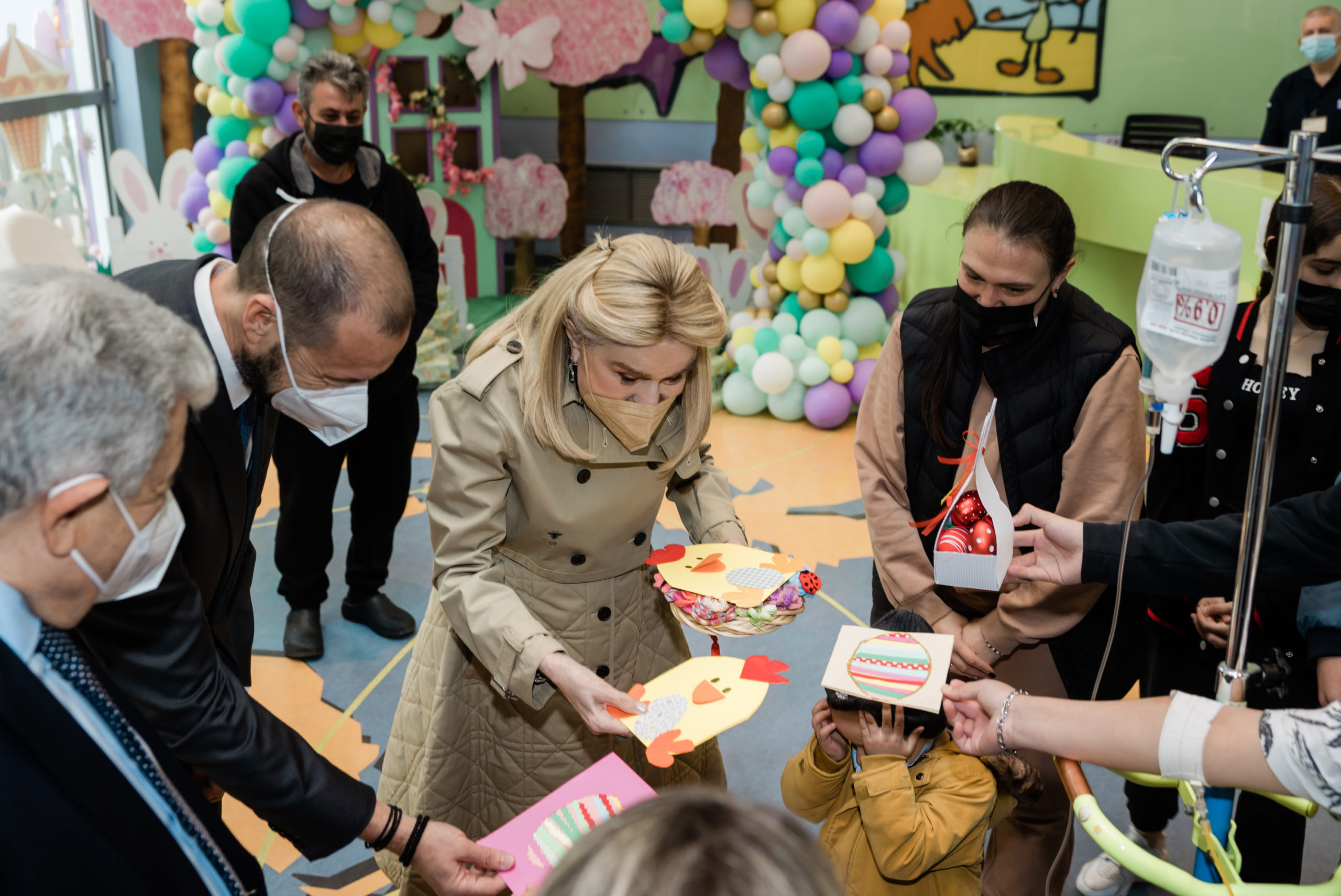 Στη συνέχεια, η κυρία Βαρδινογιάννη προσέφερε πασχαλινά δώρα σε όλα τα παιδιά που αυτές τις Άγιες Ημέρες νοσηλεύονται, ενώ συνομίλησε με τους γονείς τους και ενημερώθηκε για την κατάσταση της υγείας των παιδιών.
