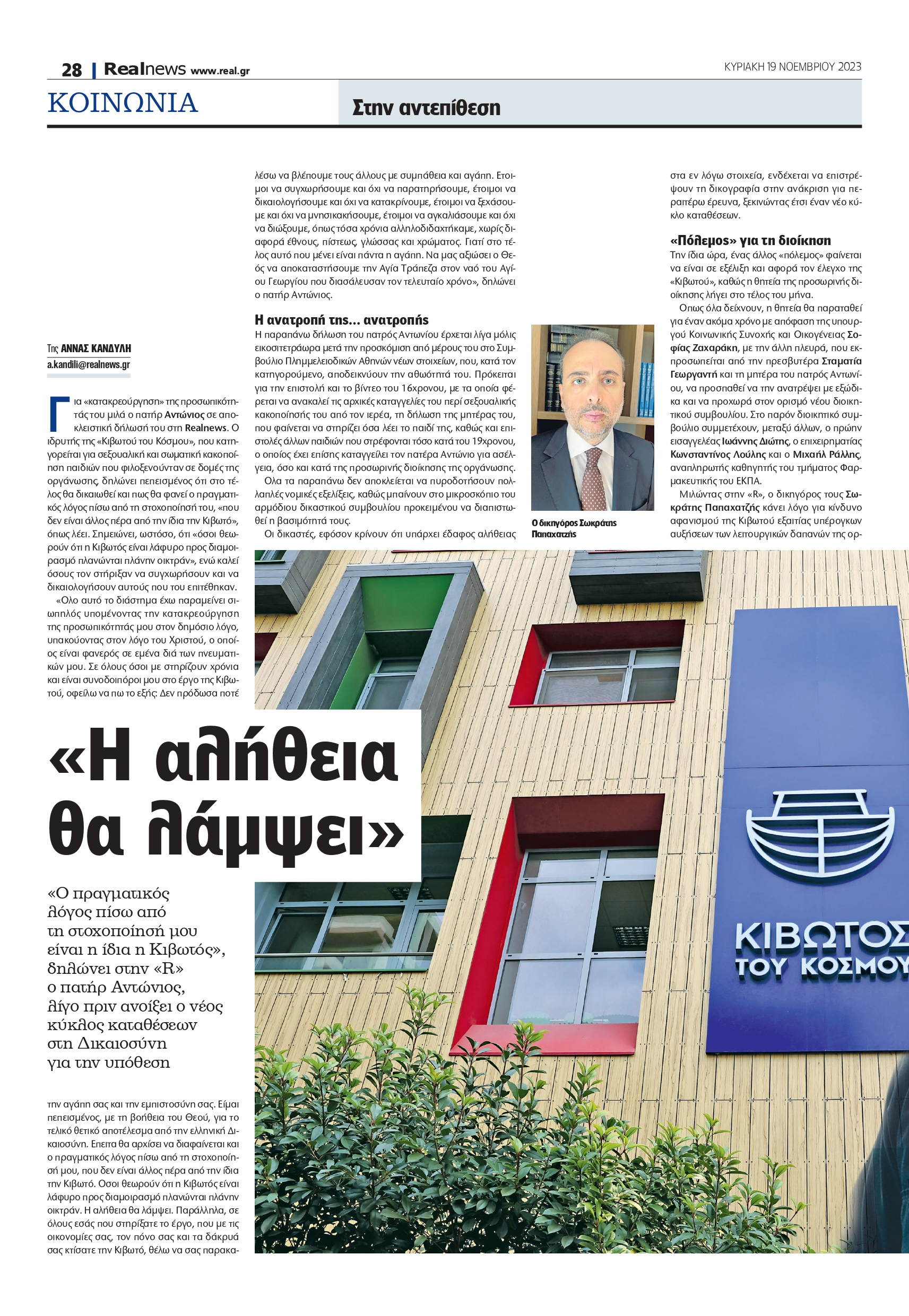 «Ο πραγματικός λόγος πίσω από τη στοχοποίησή μου είναι η ίδια η Κιβωτός», υποστηρίζει, λίγο πριν ανοίξει ο νέος κύκλος καταθέσεων στη Δικαιοσύνη για την υπόθεση. Για «κατακρεούργηση» της προσωπικότητάς του μιλά ο πατήρ Αντώνιος σε αποκλειστική δήλωσή του στη Realnews.