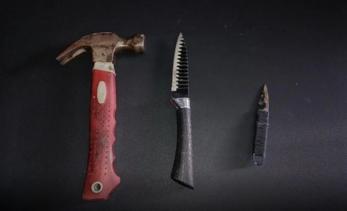 Σε έρευνα που έγινε, είχε στην κατοχή του δύο μαχαίρια, ένα σφυρί, και 6,5 γραμμ. κρυσταλλικής μεθαμφεταμίνης. Σημειώνεται ότι σε βάρος του σχηματίστηκε δικογραφία για απόπειρα ανθρωποκτονίας κατά συρροή, διατάραξη οικιακής ειρήνης και παράβαση των νόμων περί όπλων και περί εξαρτησιογόνων ουσιών.