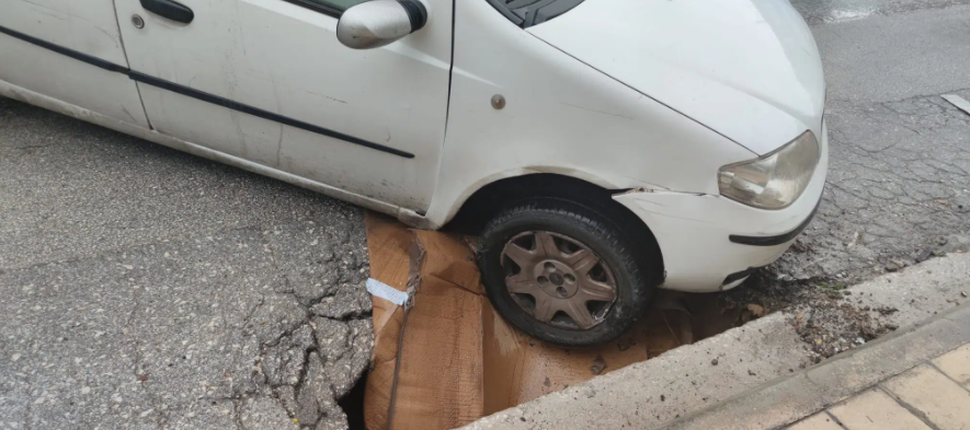 Ένα αυτοκίνητο έπεσε μέσα σε μια τρύπα που έχει ανοίξει στις οδούς Πολυκάστης και Διγενή Ακρίτα στα Μποζαΐτικα στην Πάτρα.