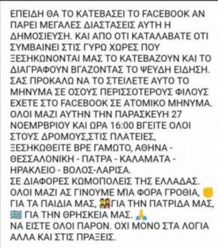 Διαδικτυακό ραντεβού δίνουν οι αρνητές του κορονοϊού και όσοι είναι κατά των μέτρων. Θα βγουν όπως αναφέρει η ανακοίνωσή τους στις 16.00 το απόγευμα της Παρασκευής όλοι έξω από τα σπίτια τους. Υποστηρίζουν δε πως η πρωτοβουλία είναι πανελλαδική. Σύμφωνα με πληροφορίες το σχετικό μήνυμα έχει φθάσει ήδη από την Τρίτη στις αρμόδιες Αρχές κυρίως στην Αθήνα (αλλά έχει ειδοποιηθεί και η Πάτρα).