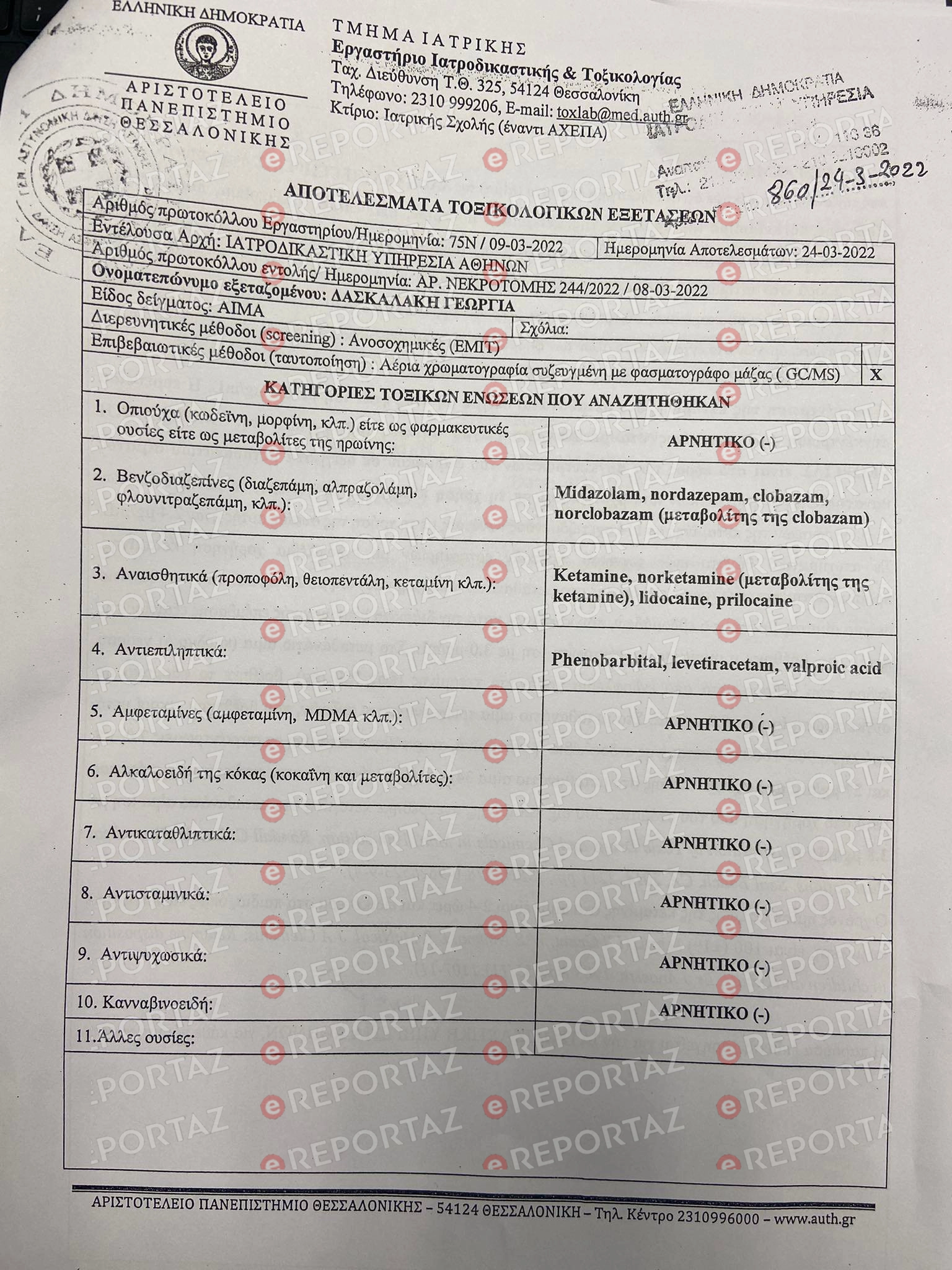 Σύμφωνα με πληροφορίες της ΕΤΤ, η μόνη ουσία που βρέθηκε στο αίμα της 9χρονης εκτός φαρμακευτικής αγωγής είναι η κεταμίνη. Όλες οι άλλες ουσίες που ανιχνεύθηκαν περιλαμβάνονταν στο φαρμακευτικό σχήμα που λάμβανε το κορίτσι. Ωστόσο, θα γίνει περαιτέρω εργαστηριακός έλεγχος για να ερευνηθεί η ποσότητα των φαρμάκων που έπαιρνε το παιδί κι αν αντιστοιχεί στις συνταγογραφούμενες δόσεις.