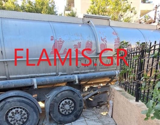 Διερχόμενοι είδαν ένα μεγάλο βυτιοφόρο που μετέφερε λάδι να «καβαλάει» το πεζοδρόμιο πλάτους 3 μέτρων και να «καρφώνεται» στη μάντρα του σπιτιού.