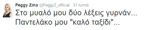 «Παντελάκο μου “καλό ταξίδι”…» έγραψε στον προσωπικό της λογαριασμό στο twitter η Πέγκυ Ζήνα λέγοντας το δικό της «αντίο» στον αγαπημένο τραγουδιστή που έφυγε τόσο απρόσμενα από τη ζωή.
