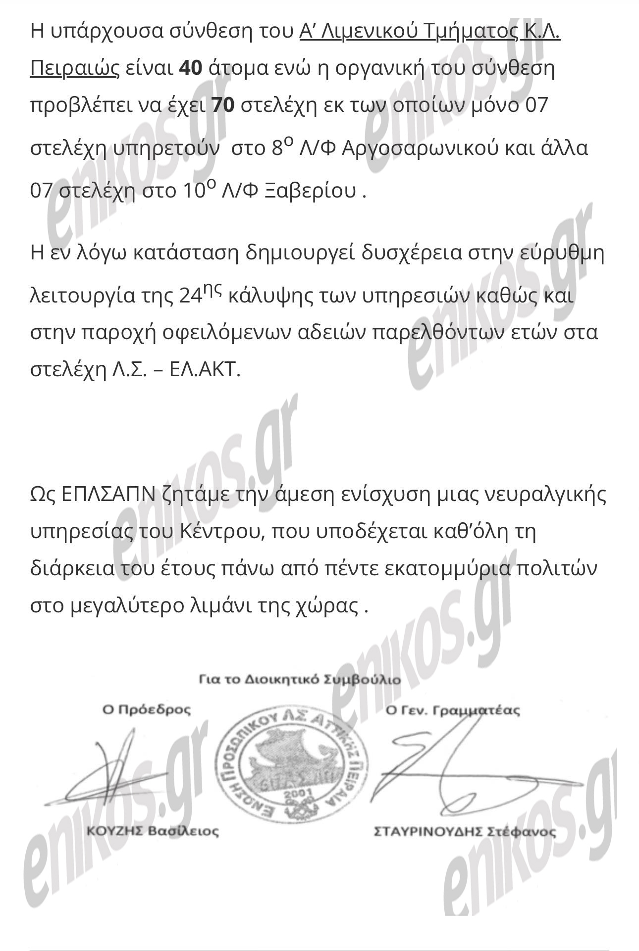 Στο έγγραφο, οι συνδικαλιστές τόνιζαν ότι «η υπάρχουσα σύνθεση του Α’ Λιμενικού Τμήματος Κ.Λ. Πειραιώς είναι 40 άτομα, ενώ η οργανική του σύνθεση προβλέπει να έχει 70 στελέχη» και συμπλήρωναν πως «η εν λόγω κατάσταση δημιουργεί δυσχέρεια στην εύρυθμη λειτουργία της 24ης κάλυψης των υπηρεσιών».