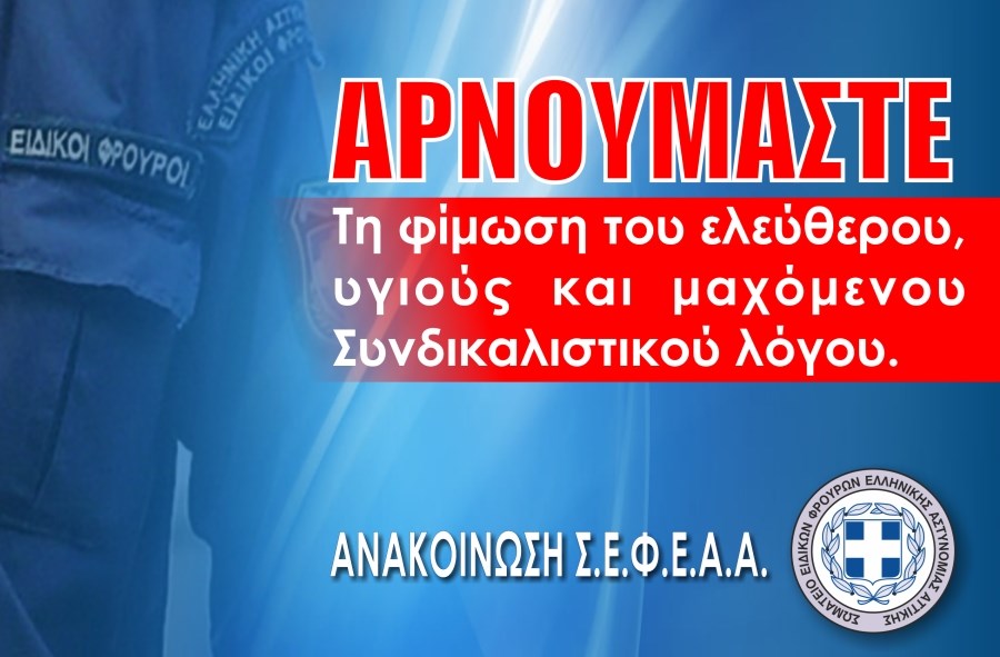 “Σε έκτακτη συνεδρίαση του το Διοικητικό Συμβούλιο του Σ.Ε.Φ.Ε.Α.Α. , αναφορικά με την κίνηση πειθαρχικής δίωξης σε βάρος του Προέδρου του, για δηλώσεις του στα πλαίσια Συνδικαλιστικής έκφρασης με απειλή επιβολής ανώτερης πειθαρχικής ποινής (Αργία με απόλυση ή αργία με πρόσκαιρη παύση), ομόφωνα αποφάσισε τα εξής :