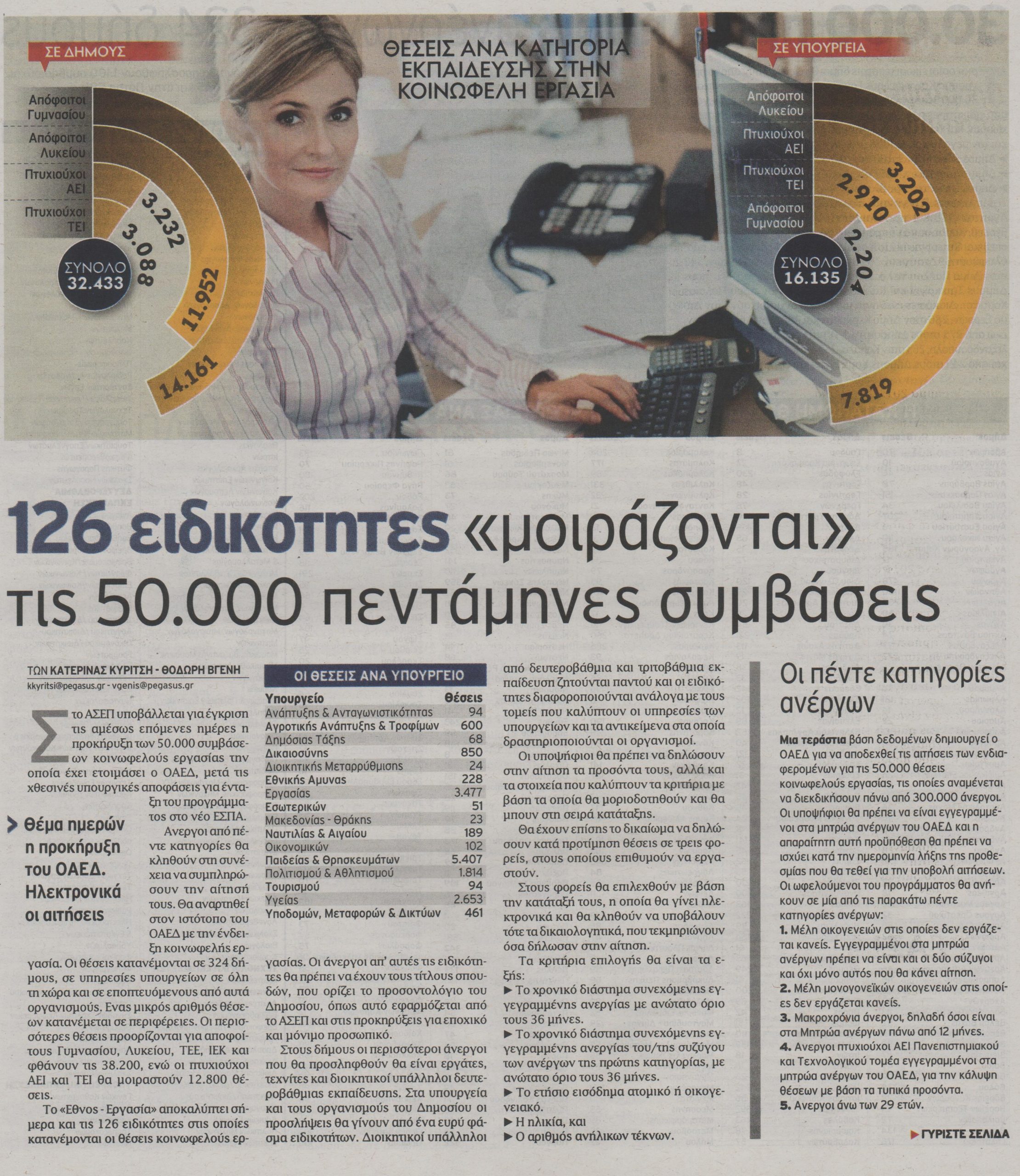 Τις 50.000 συμβάσεις που αναμένεται να προκηρύξει άμεσα το ΑΣΕΠ θα «μοιραστούν» 126 ειδικότητες.