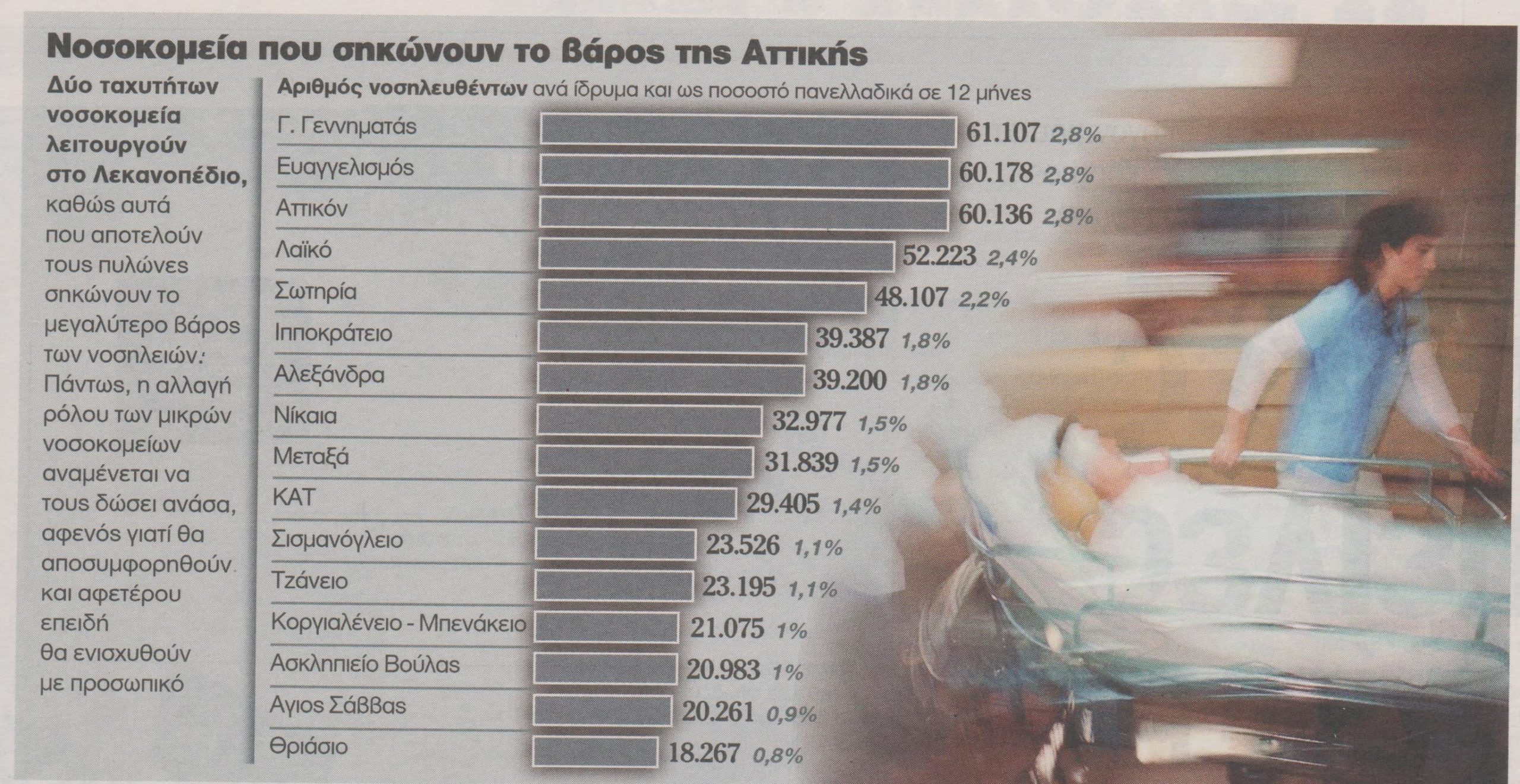 Είναι ενδεικτικό ότι, όπως προκύπτει από πρόσφατη έρευνα του υπουργείου Υγείας, έξι στους δέκα ασθενείς στριμώχνονται σε μόλις 30 νοσοκομεία της χώρας, εκ των οποίων τα 12 βρίσκονται στην Αθήνα.