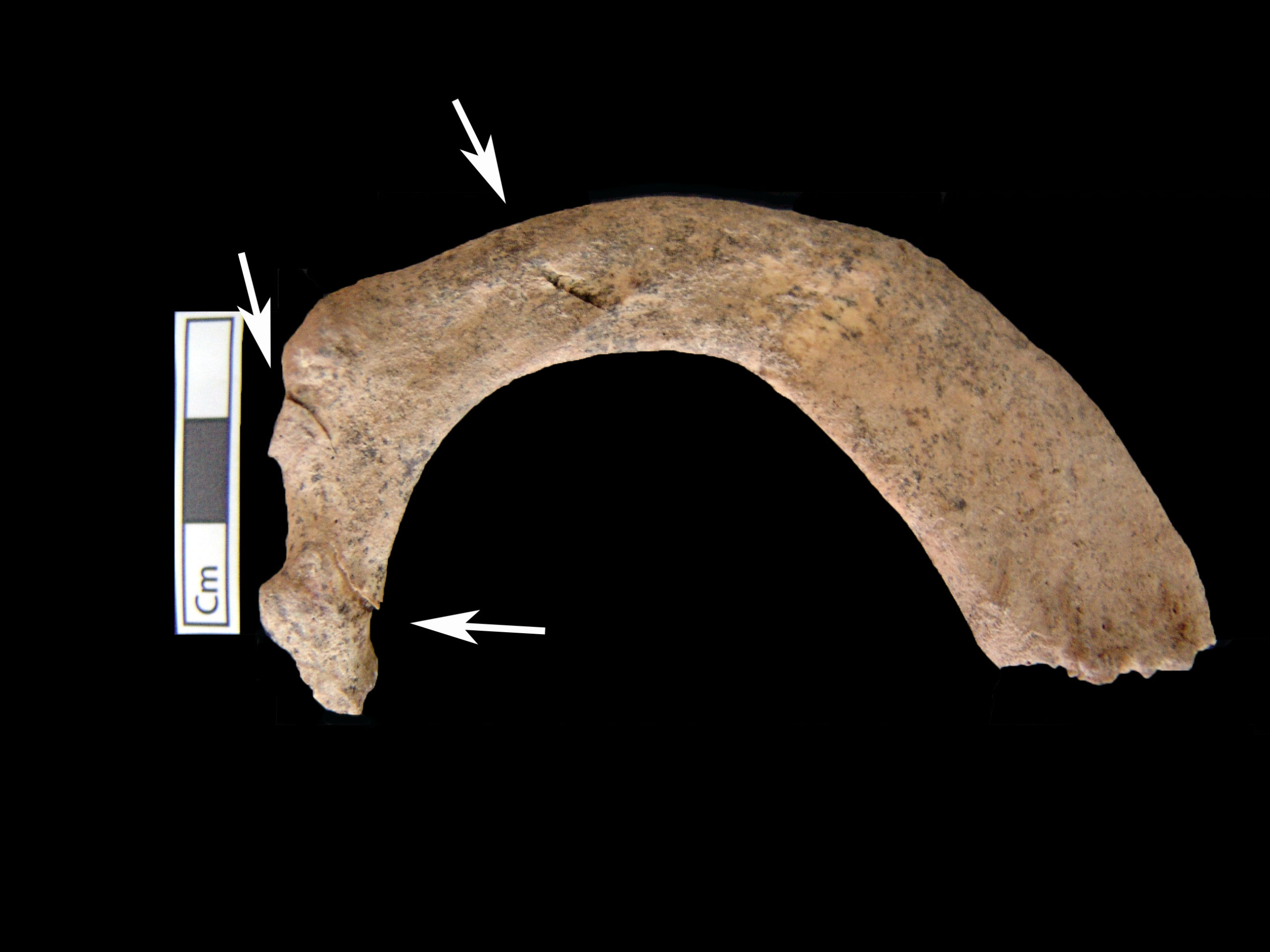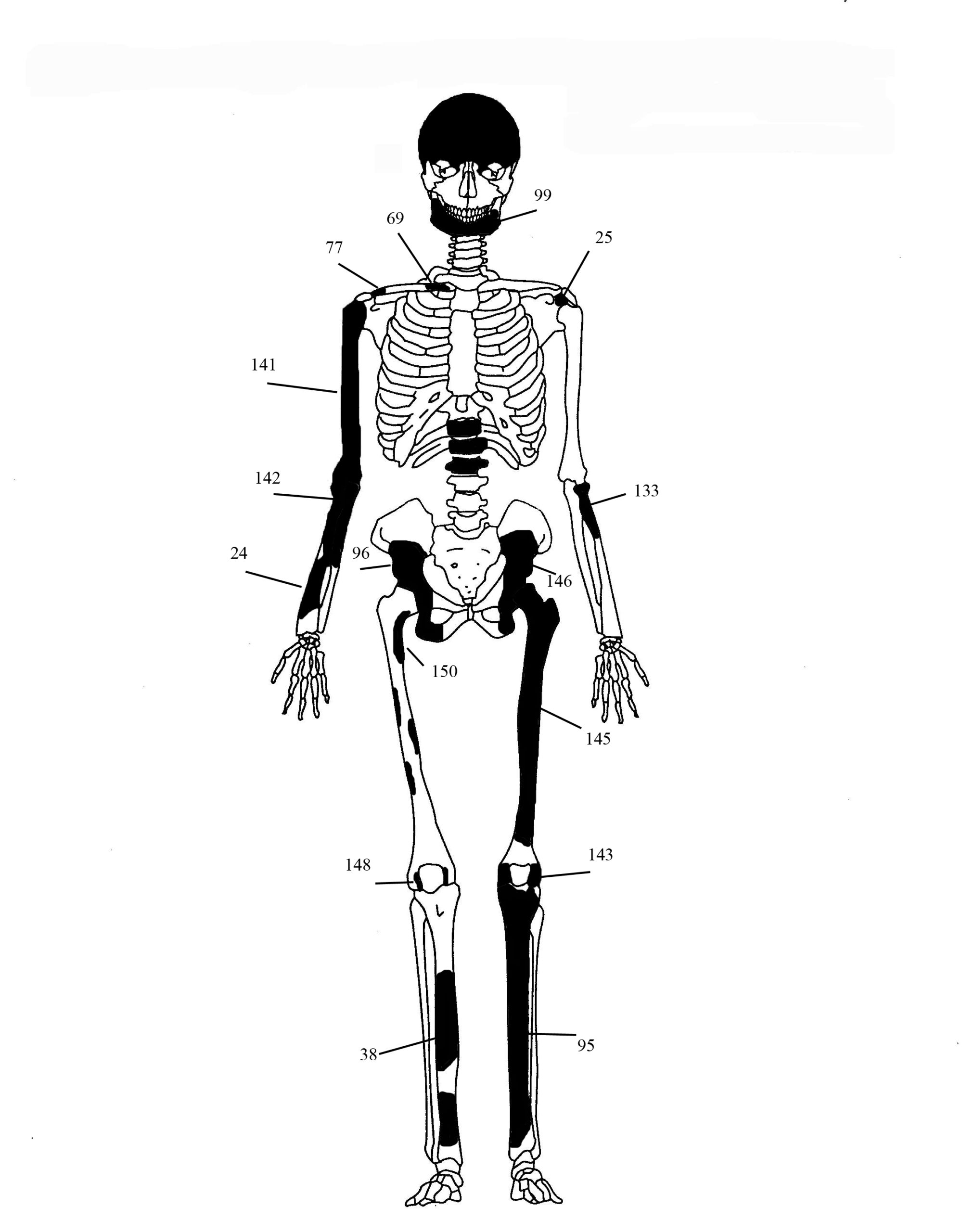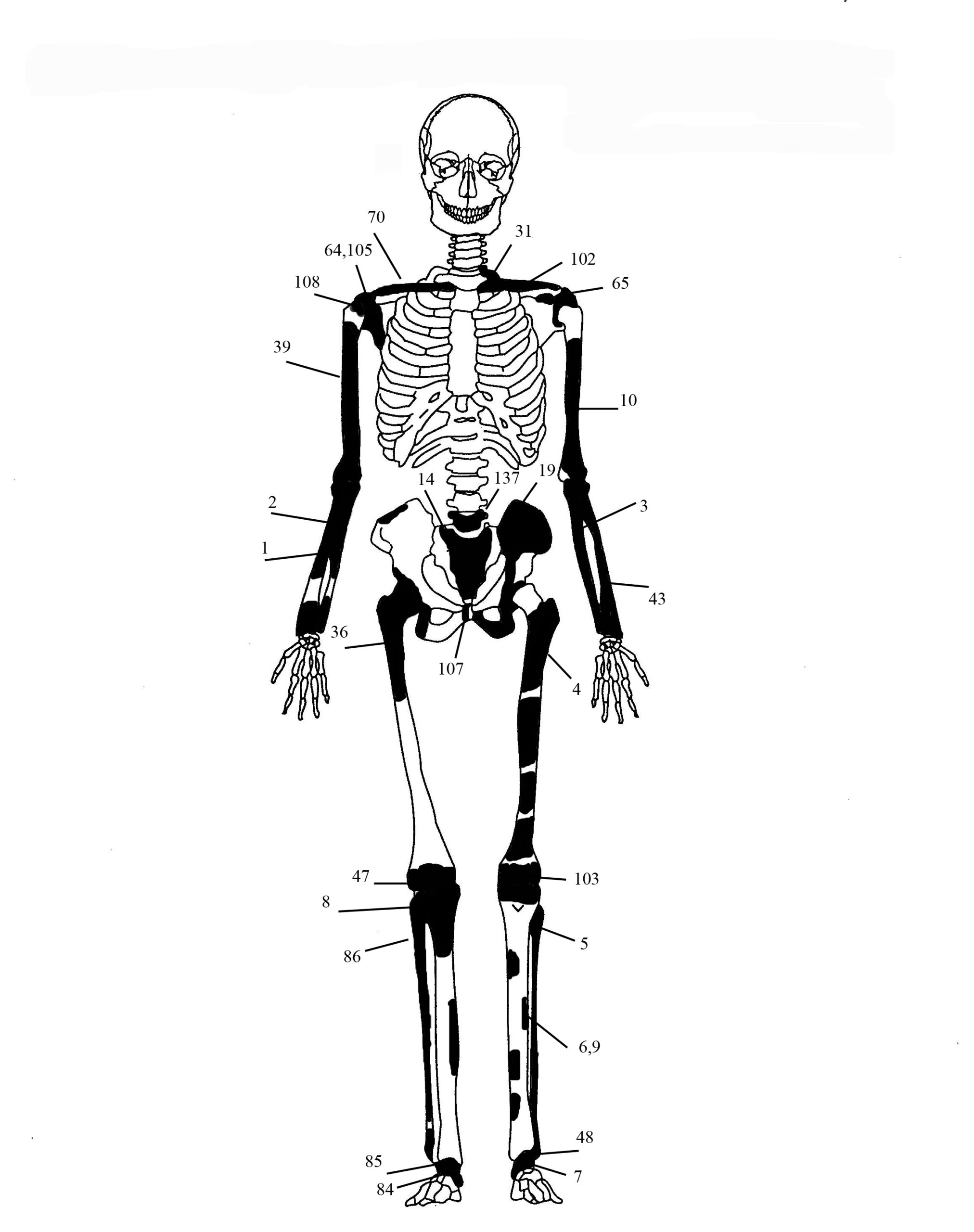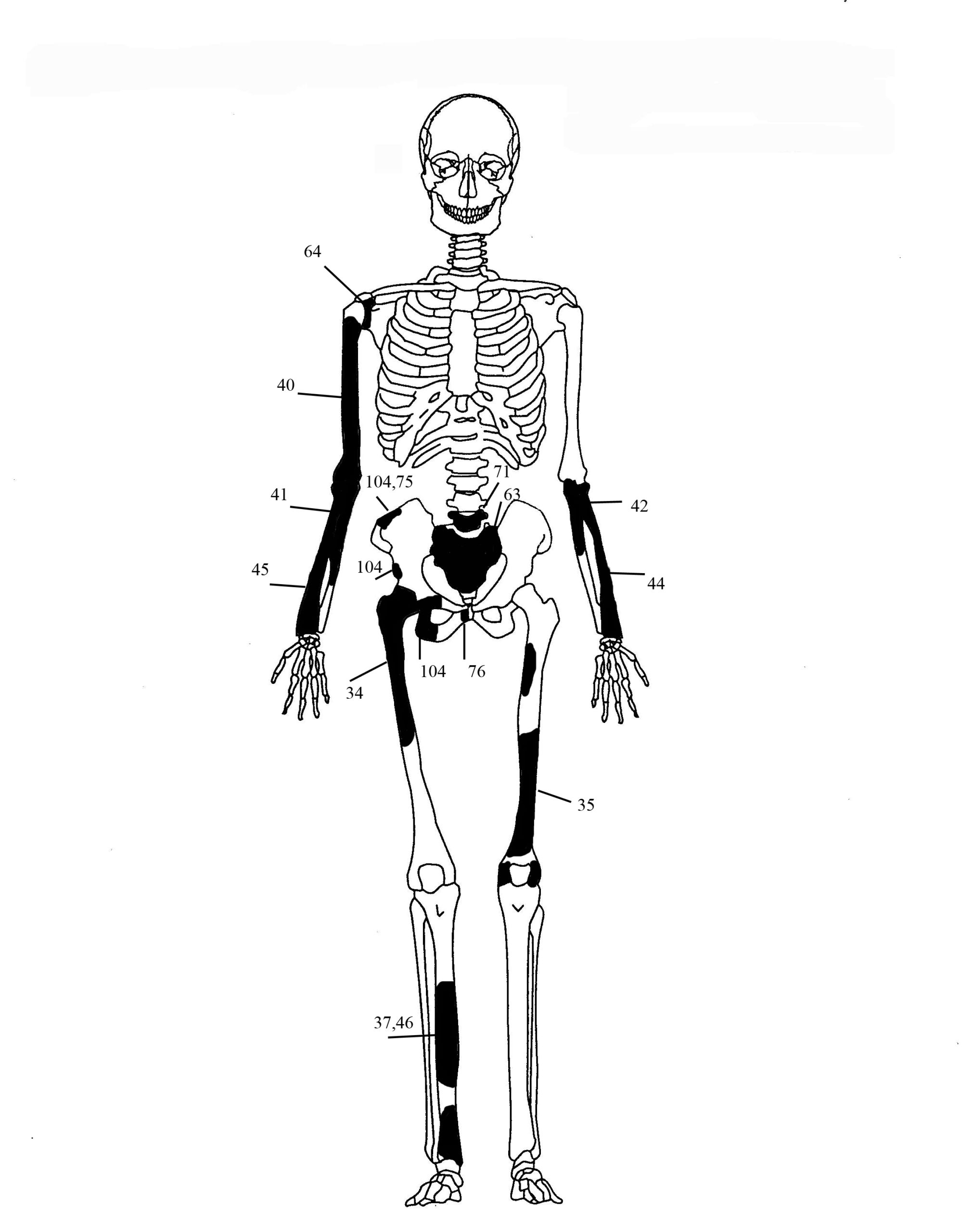 1) Στα οστά της πυέλου (λεκάνης) (αριστερή μείζων ισχιακή εντομή, δεξιά πρωτιαία αύλακα, αριστερό και δεξιό ισχιακό κύρτωμα λαγώνια ακρολοφία, σώμα και άκανθα ισχιακού),