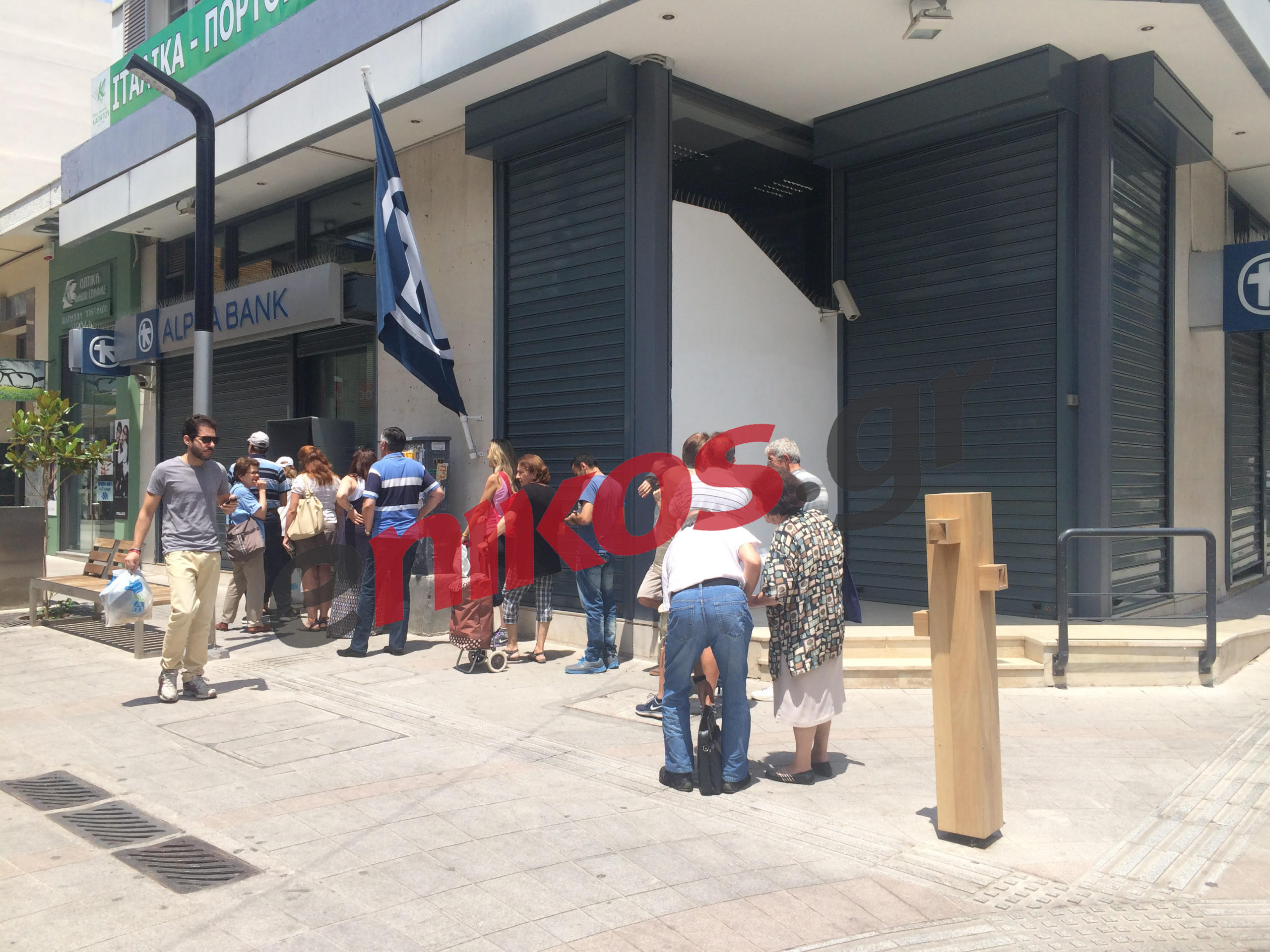 O κόσμος περιμένει στην ουρά για να τραβήξει τα 60 ευρώ από την τράπεζα.