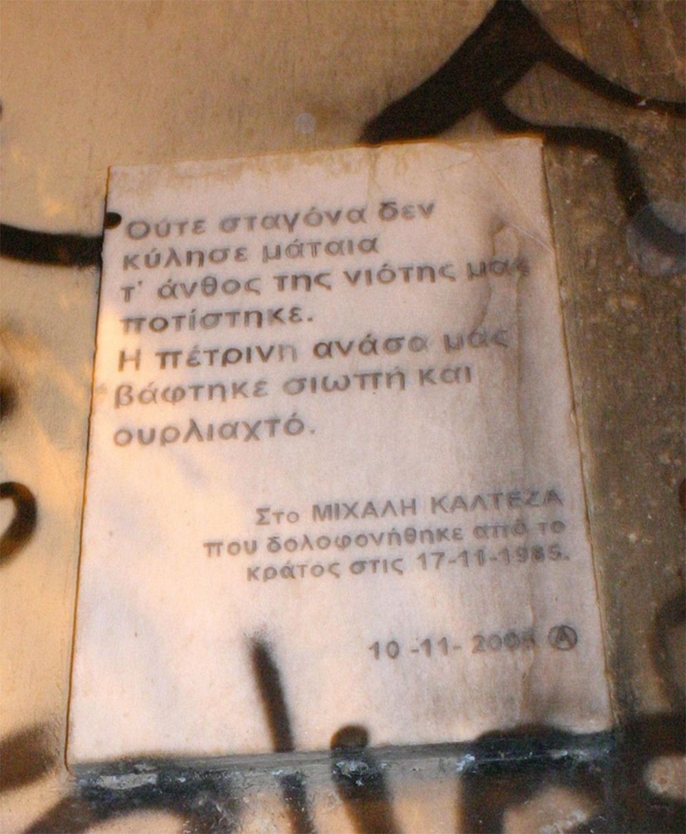 “Πριν μερικές ώρες, 16 προς 17 Ιούλη, στάση της περιπολίας υπεράσπισης των καταλήψεων, της γειτονιάς των Εξαρχείων και της μνήμης του αγώνα, μπροστά στα μνημεία του Αλέξη Γρηγορόπουλου και του Μιχάλη Καλτεζά.