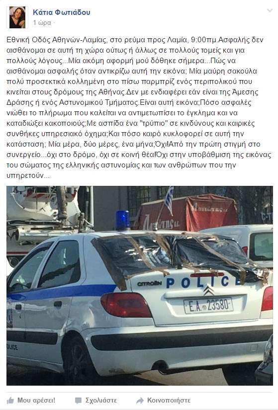Μία οδηγός στην εθνική οδό Αθηνών-Λαμίας, στο ρεύμα προς Λαμία, είδε το πρωί ένα περιπολικό να κυκλοφορεί με σπασμένο το πίσω παρμπρίζ, με τους αστυνομικούς να έχουν τοποθετήσει μαύρες σακούλες σκουπιδιών τις οποίες είχαν κολλήσει με μονωτική ταινία.Αξίζει να υπενθυμίσουμε ότι τις φθορές στα υπηρεσιακά οχήματα, τις έχουν καταγγείλει πολλές φορές και οι ίδιοι οι αστυνομικοί.