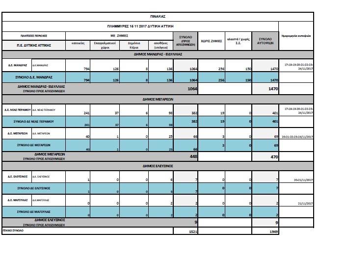 Σύμφωνα με τα επίσημα στοιχεία του υπουργείου Υποδομών, στο Δήμο Μάνδρας – Ειδυλλίας διενεργήθηκαν 1470 αυτοψίες συνολικά. Τα 1064 από τα κτίρια που ελέγχθηκαν έχουν πληγεί και χρήζουν αποζημίωσης. Συγκεκριμένα, πρόκειται για 794 κατοικίες, 126 επαγγελματικούς χώρους, οκτώ δημόσια κτίρια και 136 αποθήκες – υπόγεια. Στον Δήμο Μεγαρέων (Δ.Ε. Μεγαρέων) και στη Δ.Ε. Νέας Περάμου, διεξήχθησαν συνολικά 470 αυτοψίες εκ των οποίων τα 448 κτίρια έχουν πληγεί και χρήζουν αποζημίωσης. Πρόκειται για 281 κατοικίες, 38 επαγγελματικούς χώρους, έξι δημόσια κτίρια και 123 αποθήκες – υπόγεια.