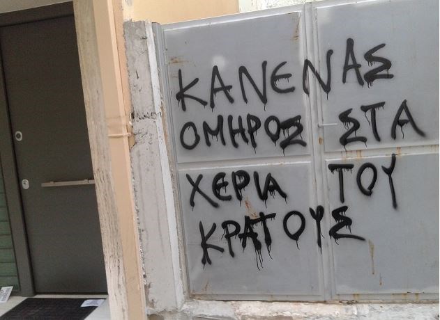 Η ομάδα των αντιεξουσιαστών, που αυτοαποκαλείται «Συνέλευση Αλληλεγγύης για τους πολιτικούς κρατούμενους τους φυλακισμένους και διωκόμενους αγωνιστές», πέταξε τρικάκια και έγραψε συνθήματα κατά του Εισαγγελέα σε πόρτα γκαράζ.