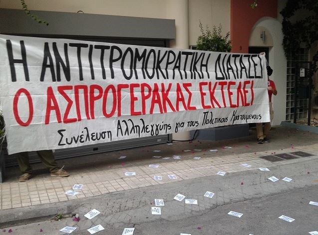 «Σήμερα, Παρασκευή 15/9 πραγματοποιήσαμε παρέμβαση έξω από το σπίτι του εισαγγελέα Δημήτρη Ασπρογέρακα. Κατά την διάρκεια της παρέμβασης πετάχτηκαν τρικάκια, ,γράφτηκαν και φωνάχτηκαν συνθήματα αλληλεγγύης. Επιλέξαμε τον συγκεκριμένο εισαγγελέα διότι μετά από δική του εισήγηση εκδόθηκε σχετικό βούλευμα που αφορά νέες διώξεις αναρχικών αιχμαλώτων, άλλων κρατουμένων και ατόμων του κοινωνικού τους περιβάλλοντος» ανέφερε μεταξύ άλλων η ομάδα των αντεξουσιαστών σε κείμενο που ανήρτησε στο athens.indymedia.org. Δείτε τις φωτογραφίες:
