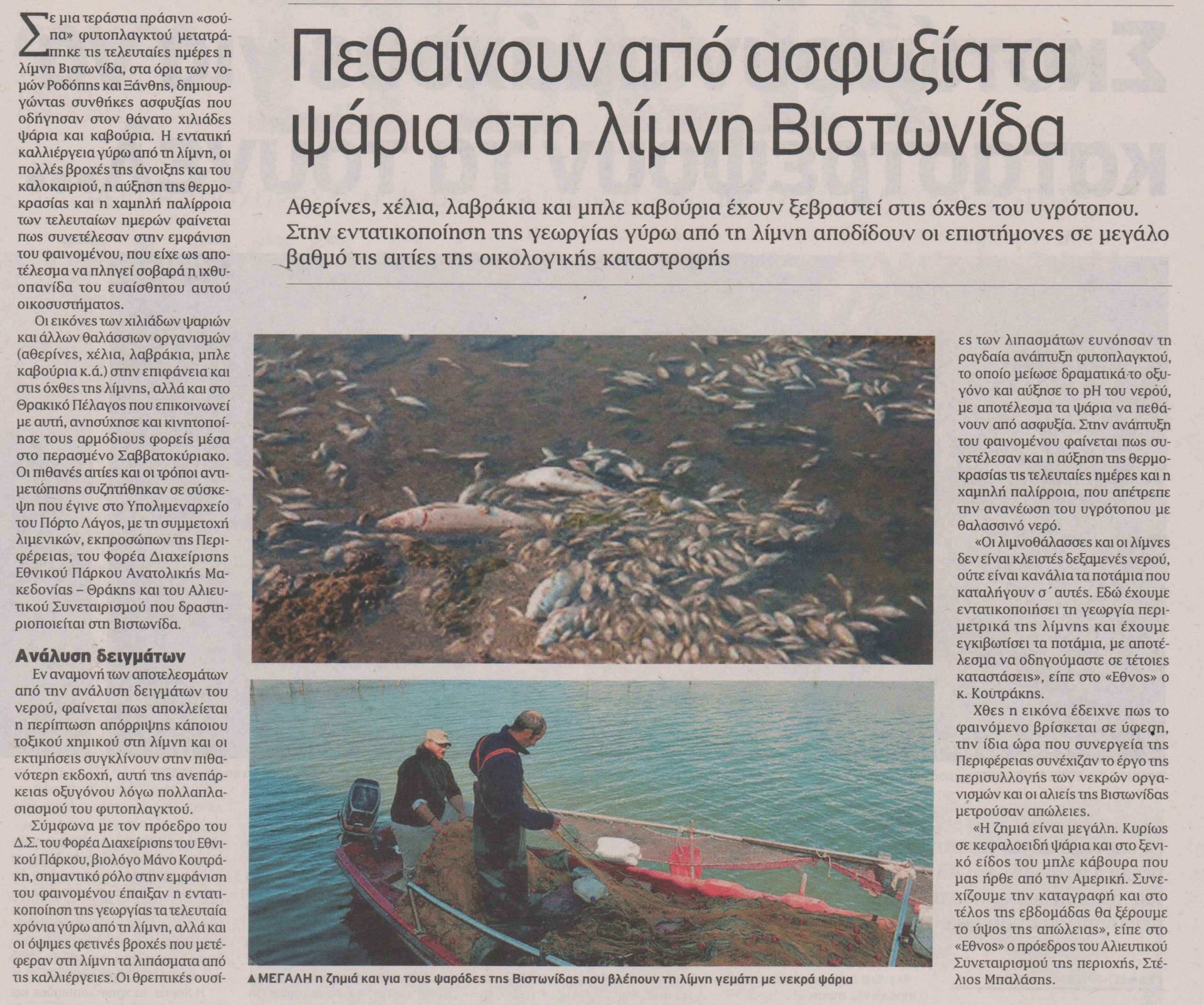 Πεθαίνουν από ασφυξία τα ψάρια στη λίμνη Βιστωνίδα