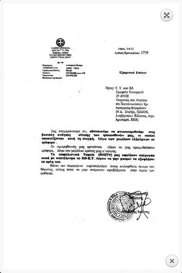 Το έγγραφο που υπογράφει ο αναπληρωτής διοικητής του νοσοκομείου, αναφέρει: «Τα ασφαλιστικά ταμεία (ΕΟΠΥΥ) μας οφείλουν υπέρογκα ποσά, με αποτέλεσμα το ΚΘ-ΚΥ Λέρου να μην μπορεί να εξοφλήσει τα χρέη του».