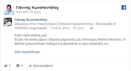 Συγκλονισμένος από την απώλειά της και ο Δήμαρχος Ελληνικού-Αργυρούπολης, Γιάννης Κωνσταντάτος, ο οποίος αποχαιρέτησε την άτυχη αστυνομικό με μια ανάρτηση στο Facebook.