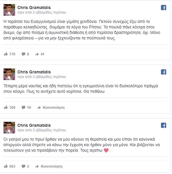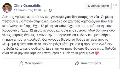 Ο Χρήστος Γραμματίδης διαγνώστηκε πριν κάποιους μήνες με μη Hodgkins λέμφωμα σταδίου 4, ένα είδος καρκίνου του λεμφικού συστήματος.