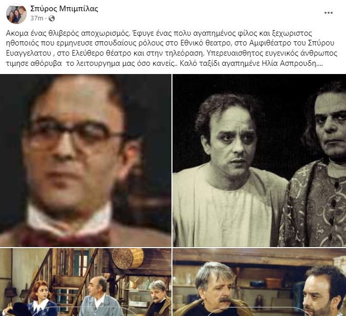«Ακόμα ένας θλιβερός αποχωρισμός. Έφυγε ένας πολύ αγαπημένος φίλος και ξεχωριστός ηθοποιός που ερμήνευσε σπουδαίους ρόλους στο Εθνικό θέατρο, στο Αμφιθέατρο του Σπύρου Ευαγγελάτου, στο Ελεύθερο θέατρο και στην τηλεόραση. Υπερευαίσθητος, ευγενικός άνθρωπος, τίμησε αθόρυβα το λειτούργημα μας όσο κανείς.. Καλό ταξίδι αγαπημένε Ηλία Ασπρούδη….» έγραψε στην ανάρτηση.