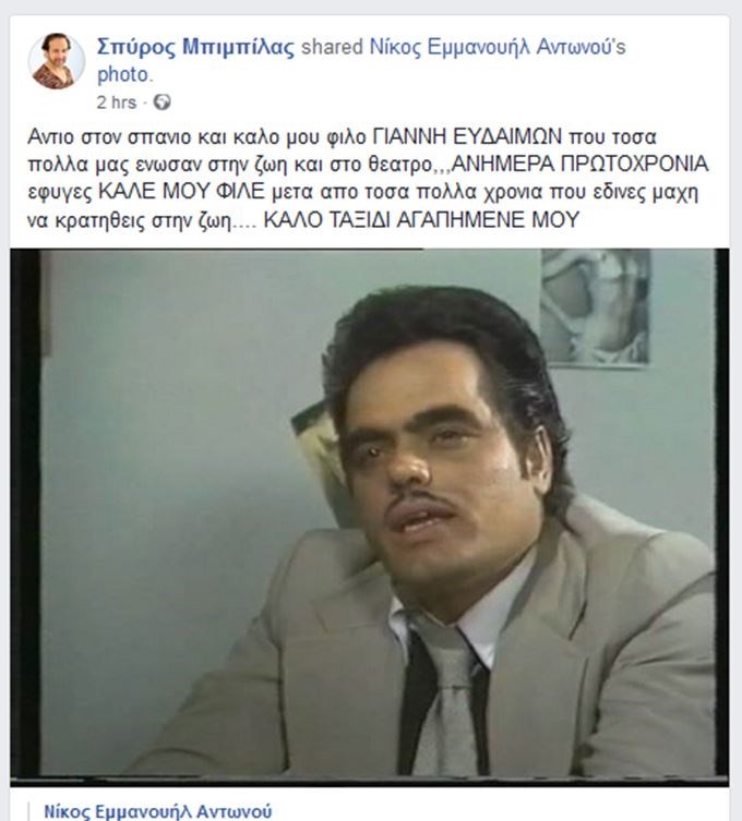 «Αντίο στον σπάνιο και καλό μου φίλο, Γιάννη Ευδαίμων, που τόσα πολλά μας ένωσαν στη ζωή και στο θέατρο. Ανήμερα Πρωτοχρονιάς έφυγες καλέ μου φίλε, μετά από τόσα πολλά χρόνια που έδινες μάχη για να κρατηθείς στη ζωή. Καλό ταξίδι αγαπημένε μου», έγραψε ο ηθοποιός.