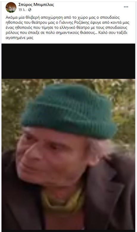 Έφυγε από τη ζωή ο ηθοποιός Γιάννης Ροζάκης. Τη θλιβερή είδηση έκανε γνωστή ο Σπύρος Μπιμπίλας με ανάρτησή του στο facebook: “Ακόμα μία θλιβερή αποχώρηση από το χώρο μας ο σπουδαίος ηθοποιός του θεάτρου μας ο Γιάννης Ροζάκης έφυγε από κοντά μας ένας ηθοποιός που τίμησε το ελληνικό θέατρο με τους σπουδαίους ρόλους που έπαιξε σε πολύ σημαντικούς θιάσους… Καλό σου ταξίδι αγαπημένε μας” έγραψε ο γνωστός ηθοποιός.