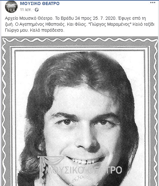 “Αρχείο Μουσικό Θέατρο. Το Βράδυ 24 προς 25. 7. 2020. Έφυγε από τη ζωή. Ο Αγαπημένος Ηθοποιός. Και Φίλος. “Γιώργος Μαραμένος” Καλό ταξίδι Γιώργο μου. Καλό παράδεισο.”