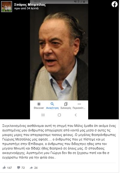 «Αισθάνομαι συγκλονισμένος αυτή τη στιγμή. Μόλις έμαθα ότι ακόμα ένας αγαπημένος μου άνθρωπος αποχώρησε από κοντά μας μέσα σε αυτές τις μαύρες μέρες που αποχαιρετάμε τόσους φίλους… Ο μεγάλος θεατράνθρωπος Γιώργος Μεσσάλας μας άφησε… Ο άνθρωπος που με πίστεψε και με πρωτοπήγε στην Επίδαυρο, ο άνθρωπος που διδάχτηκε ήθος από τον μεγάλο Μινωτή και δίδαξε ήθος θεατρικό σε όλους μας… Ο σπουδαίος οικογενειάρχης. Αγαπημένε μου Γιώργο δεν θα σε ξεχάσω ποτέ και θα σε ευχαριστώ πάντα για την φιλία σου…», έγραψε στην ανάρτησή του ο Σπύρος Μπιμπίλας.