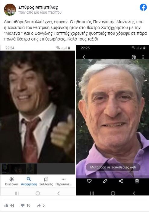 «Δύο αθόρυβοι καλλιτέχνες έφυγαν..Ο ηθοποιός Παναγιώτης Μαντελης που η τελευταία του θεατρική εμφάνιση ήταν στο θέατρο Χατζηχρήστου με την “Μαλενα ” Και ο Βαγγέλης Παππάς χορευτής ηθοποιός που χόρεψε σε πάρα πολλά θέατρα στις επιθεωρήσεις..Καλό τους ταξίδι», έγραψε ο Σπύρος Μπιμπίλας.