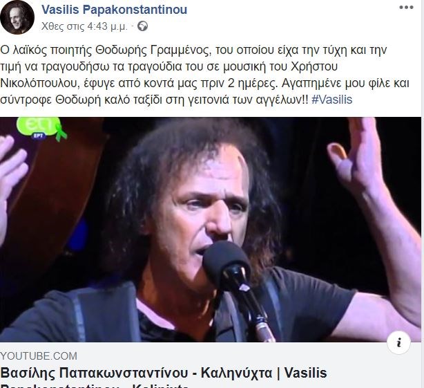 “O λαϊκός ποιητής Θοδωρής Γραμμένος, του οποίου είχα την τύχη και την τιμή να τραγουδήσω τα τραγούδια του σε μουσική του Χρήστου Νικολόπουλου, έφυγε από κοντά μας πριν 2 ημέρες. Αγαπημένε μου φίλε και σύντροφε Θοδωρή καλό ταξίδι στη γειτονιά των αγγέλων!!, έγραψε ο δημοφιλής τραγουδιστής”.