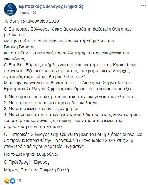Την είδηση έκανε γνωστή ο Εμπορικός Σύλλογος Κηφισιάς, εκφράζοντας τη βαθύτατη θλίψη των μελών του για την απώλεια του Βασίλη Βάρσου και συλλυπητήρια στην οικογένεια του εκλιπόντος.