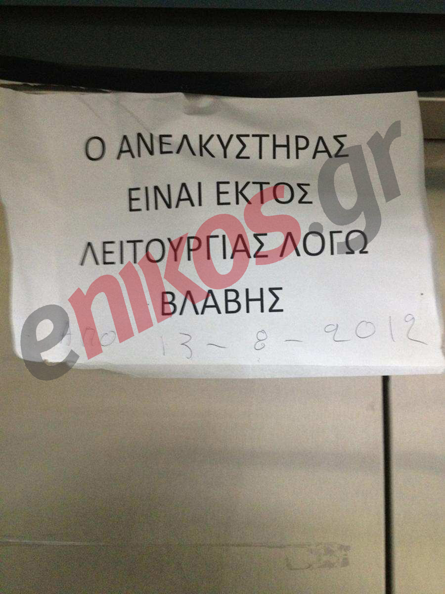 Όπως βλέπετε στις φωτογραφίες που μας έστειλε, ο ανελκυστήρας είναι εκτός λειτουργίας, λόγω βλάβης, από τις 13 Αυγούστου 2012.