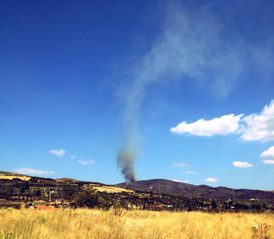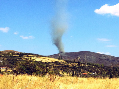 Παρασκευή απόγευμα στον ορίζοντα μεταξύ Διστόμου και Λιβαδειάς, κοντά στον ΧΥΤΑ στους Τσουκαλάδες: Ήταν ο ίδιος άνεμος που έσπρωξε προχθές τις φλόγες σε μία ξέφρενη πορεία ολέθρου, απειλώντας χωριά και πόλεις και καταστρέφοντας περιουσίες αγροτών, κτηνοτρόφων, επαγγελματιών.