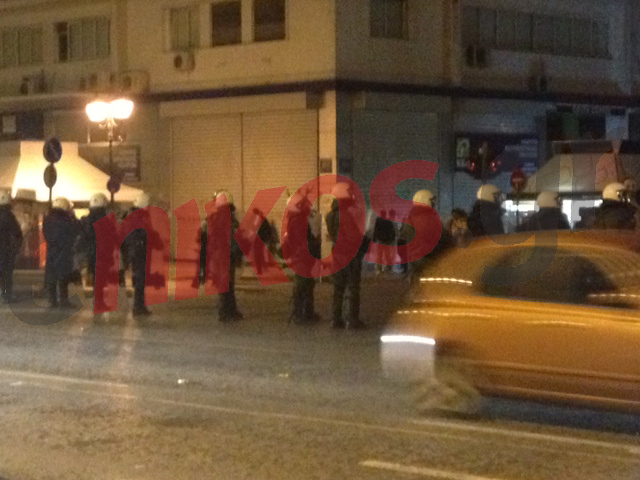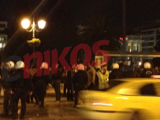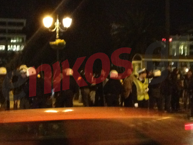 Ανοιχτή είναι αυτή την ώρα και πάλι η Αμαλίας. Άνδρες των ΜΑΤ στέκονται επί της νησίδας στη λεωφόρο Αμαλίας.