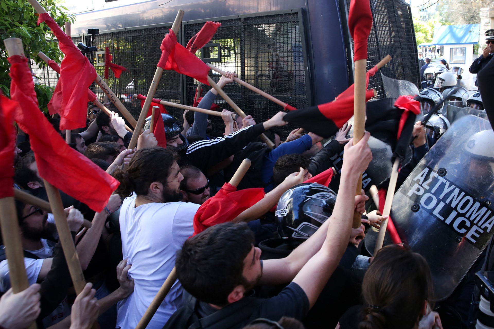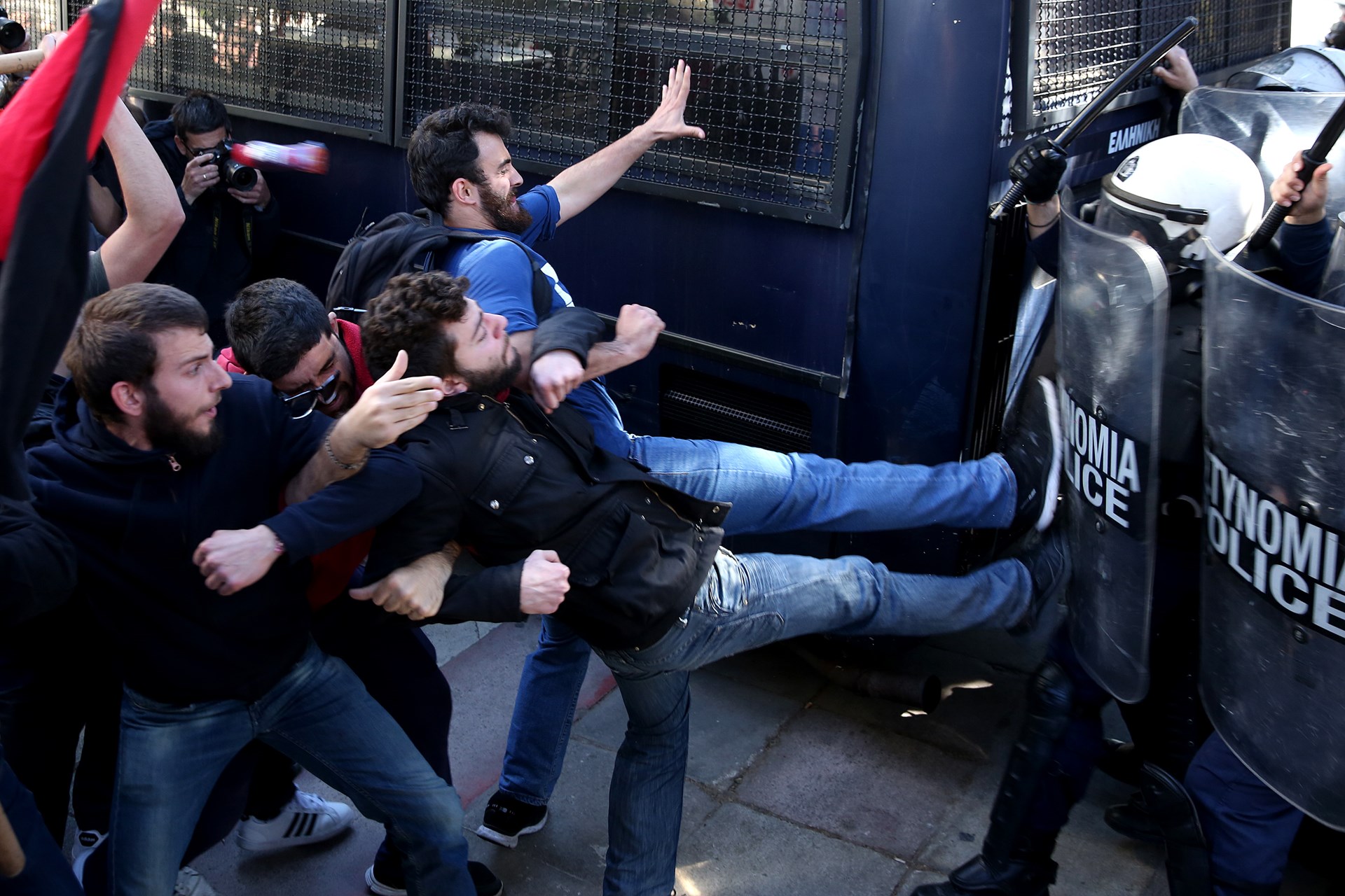 Νωρίτερα, επικράτησε ένταση όταν διαδηλωτές προσπάθησαν με τα χέρια τους να ανατρέψουν κλούβα των ΜΑΤ, που απάντησαν κάνοντας χρήση δακρυγόνων.Δείτε τις φωτογραφίες: