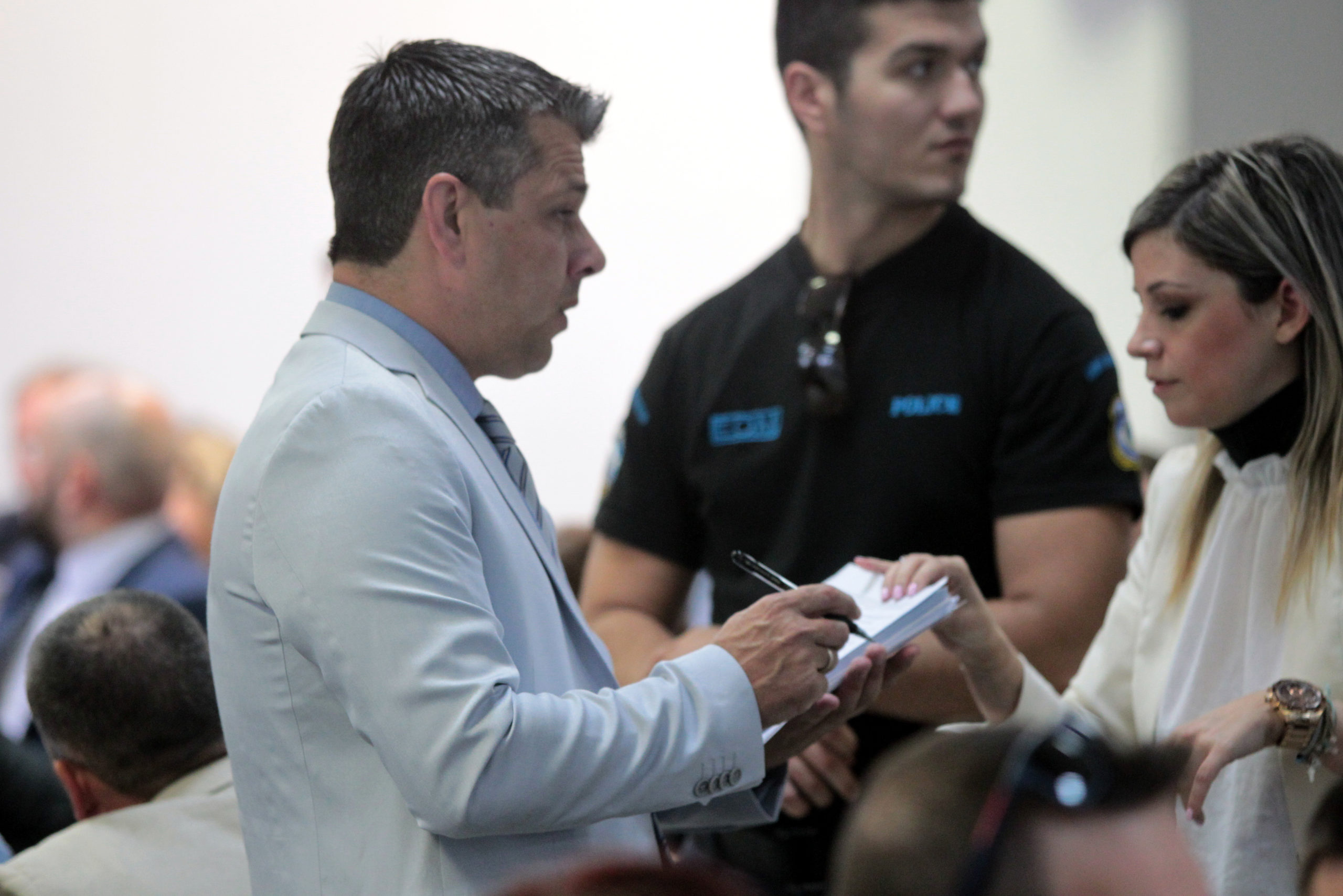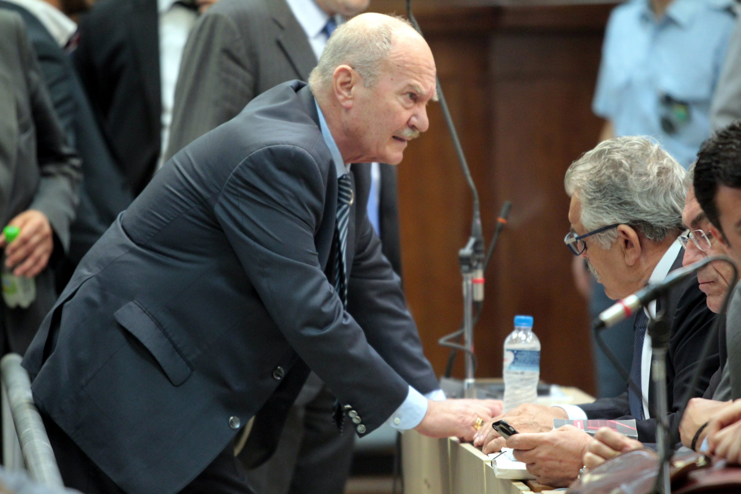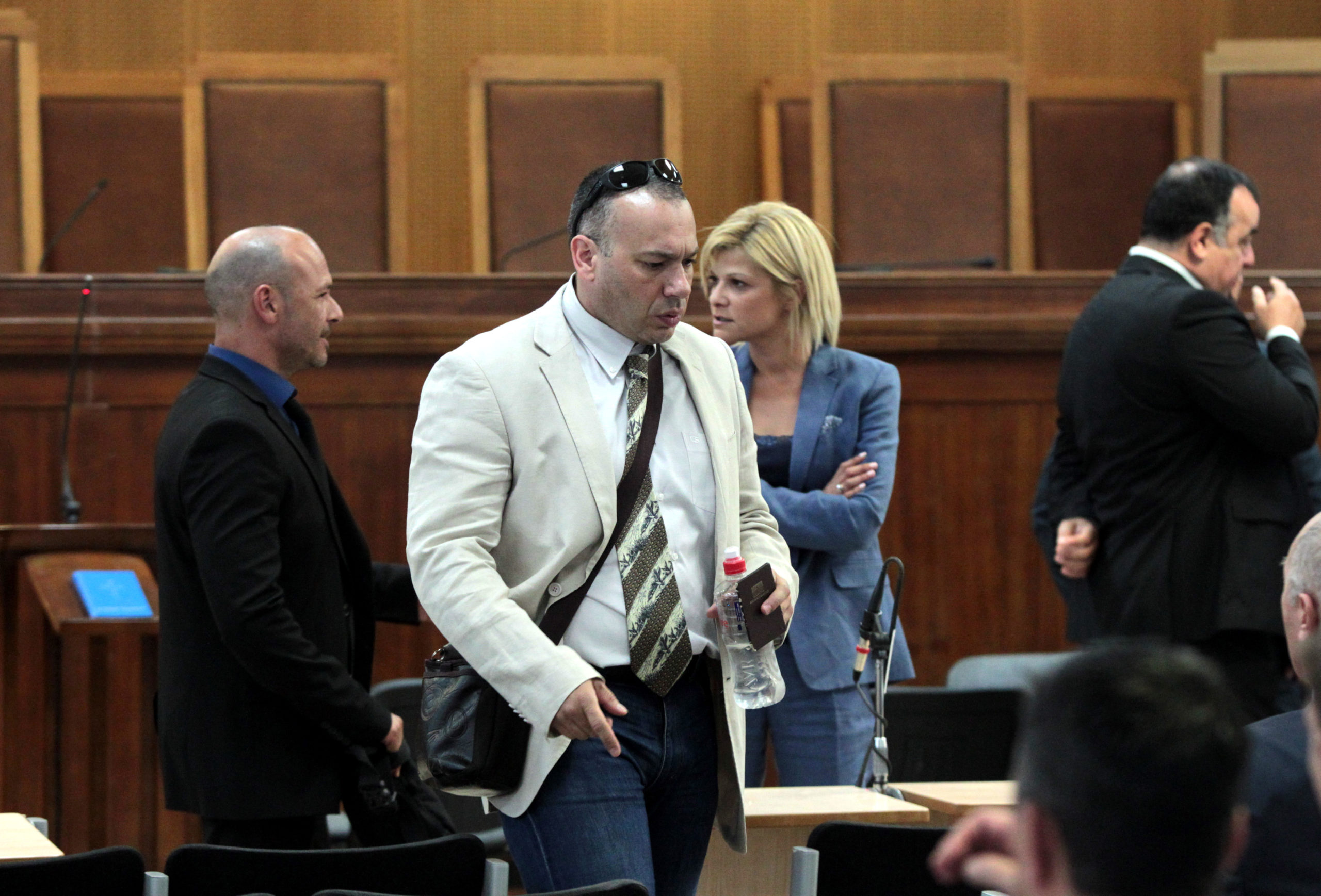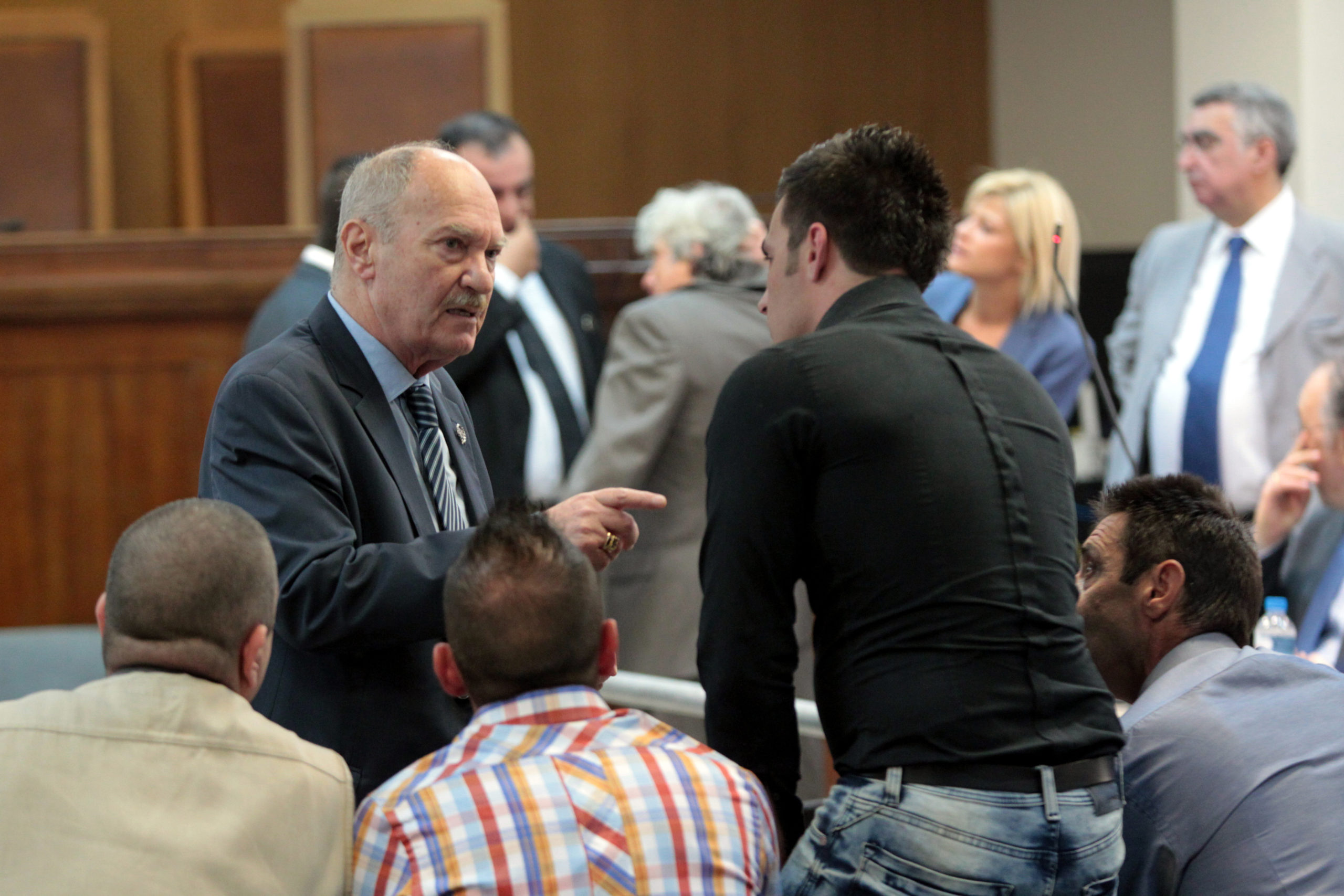 Ο κατηγορούμενος βουλευτής Νίκος Αρβανίτης συνομιλεί με τον Ιωάννη Καζαντζόγλου και άλλους κατηγορούμενους.