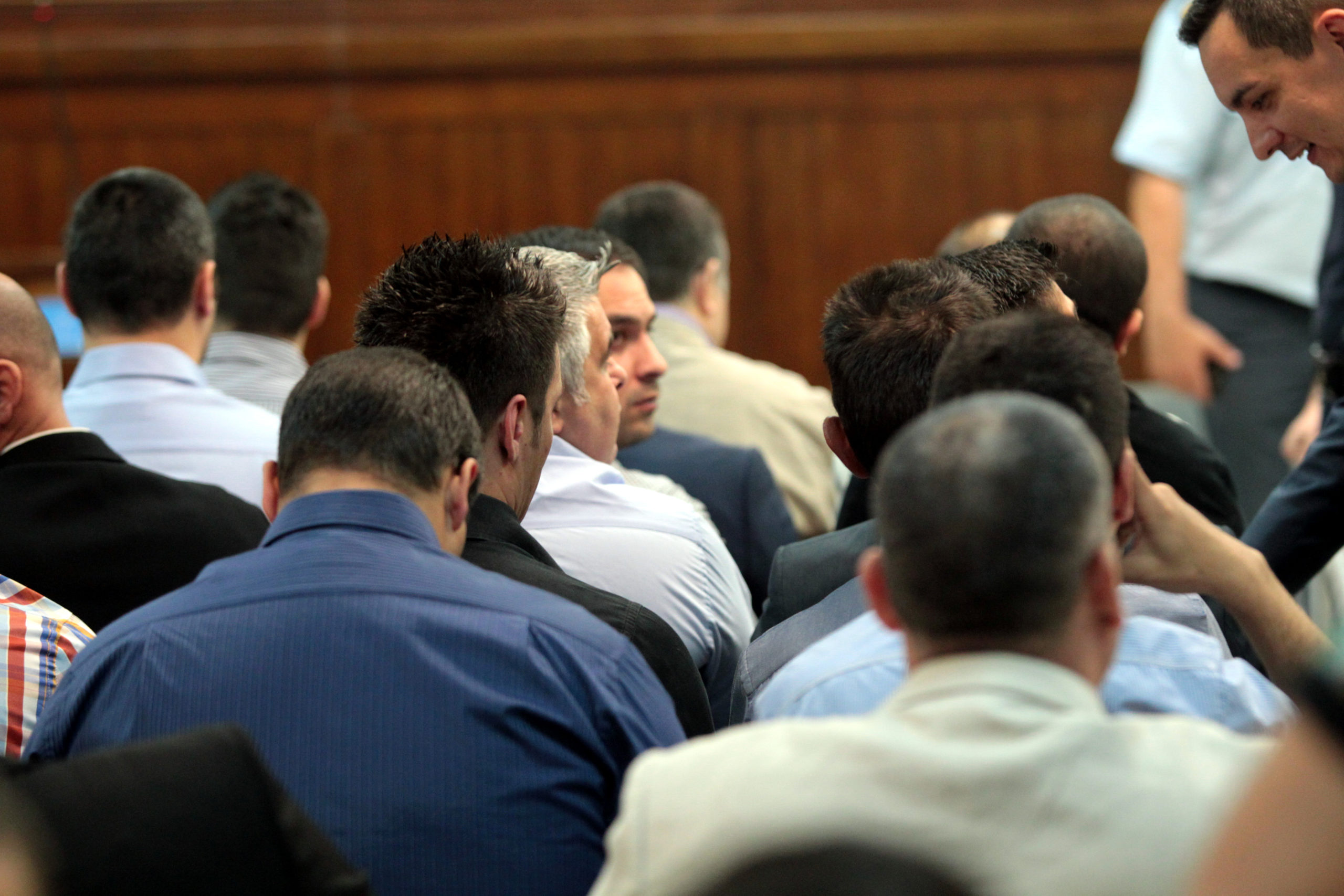 Ο κατηγορούμενος βουλευτής Νίκος Αρβανίτης συνομιλεί με τον Ιωάννη Καζαντζόγλου και άλλους κατηγορούμενους στην αίθουσα των γυναικείων φυλακών του Κορυδαλλού.