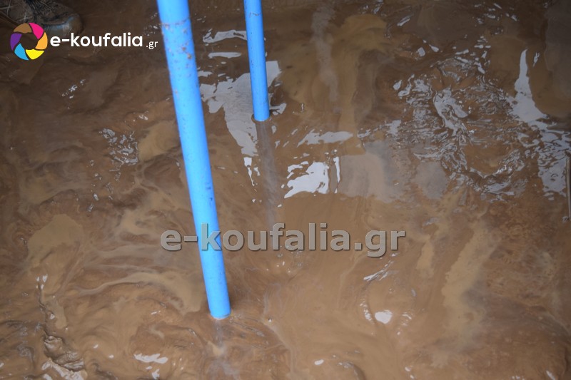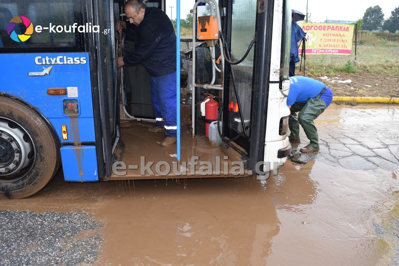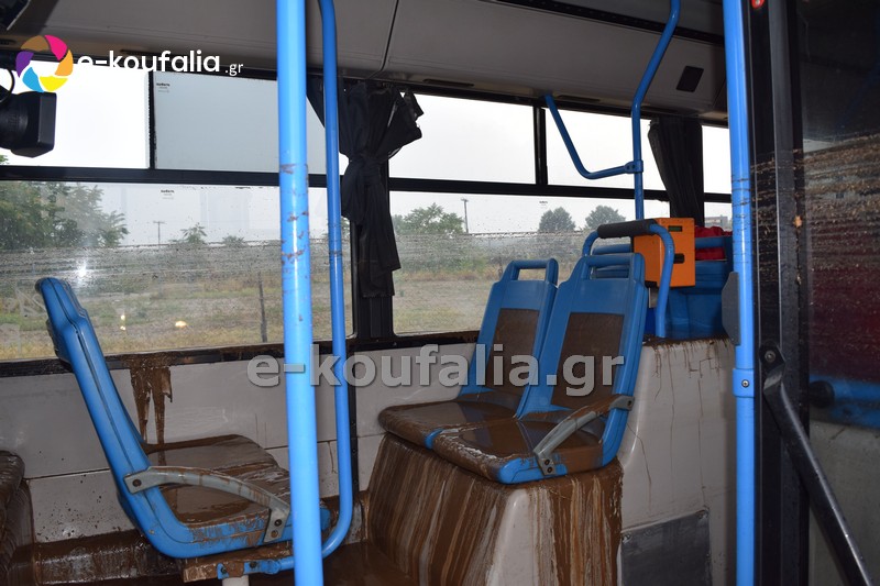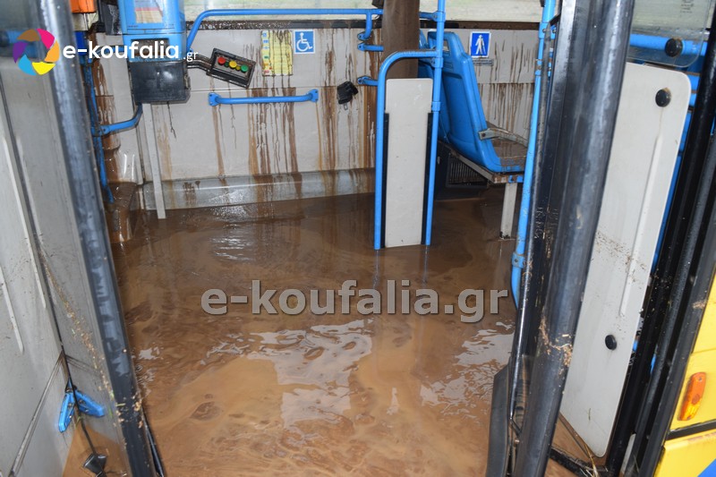 Όπως φαίνεται στις φωτογραφίες που δημοσιεύει το e-koufalia.gr από το εσωτερικό του λεωφορείου τα λασπόνερα είχαν φτάσει μέχρι τη μέση του οχήματος.