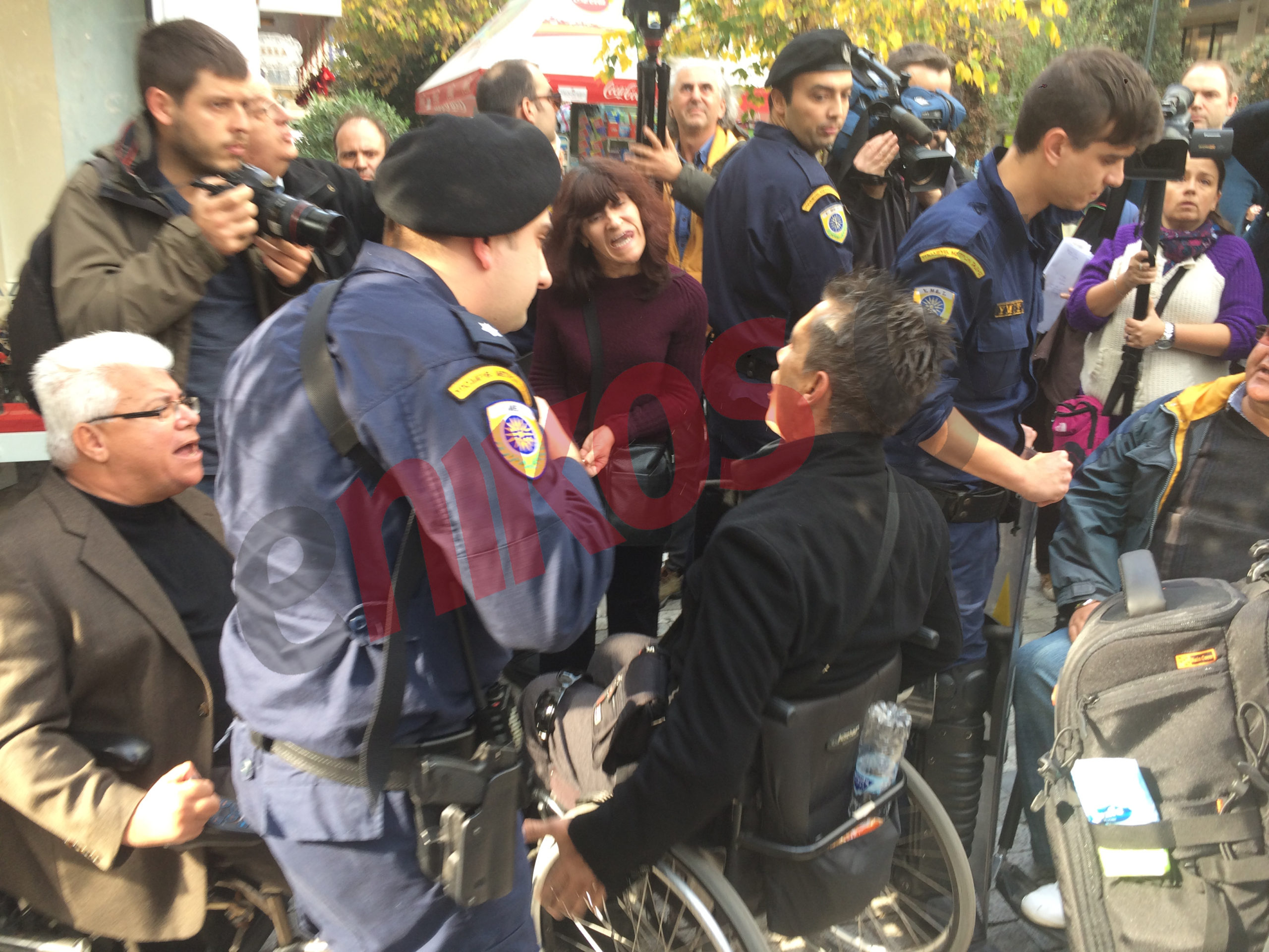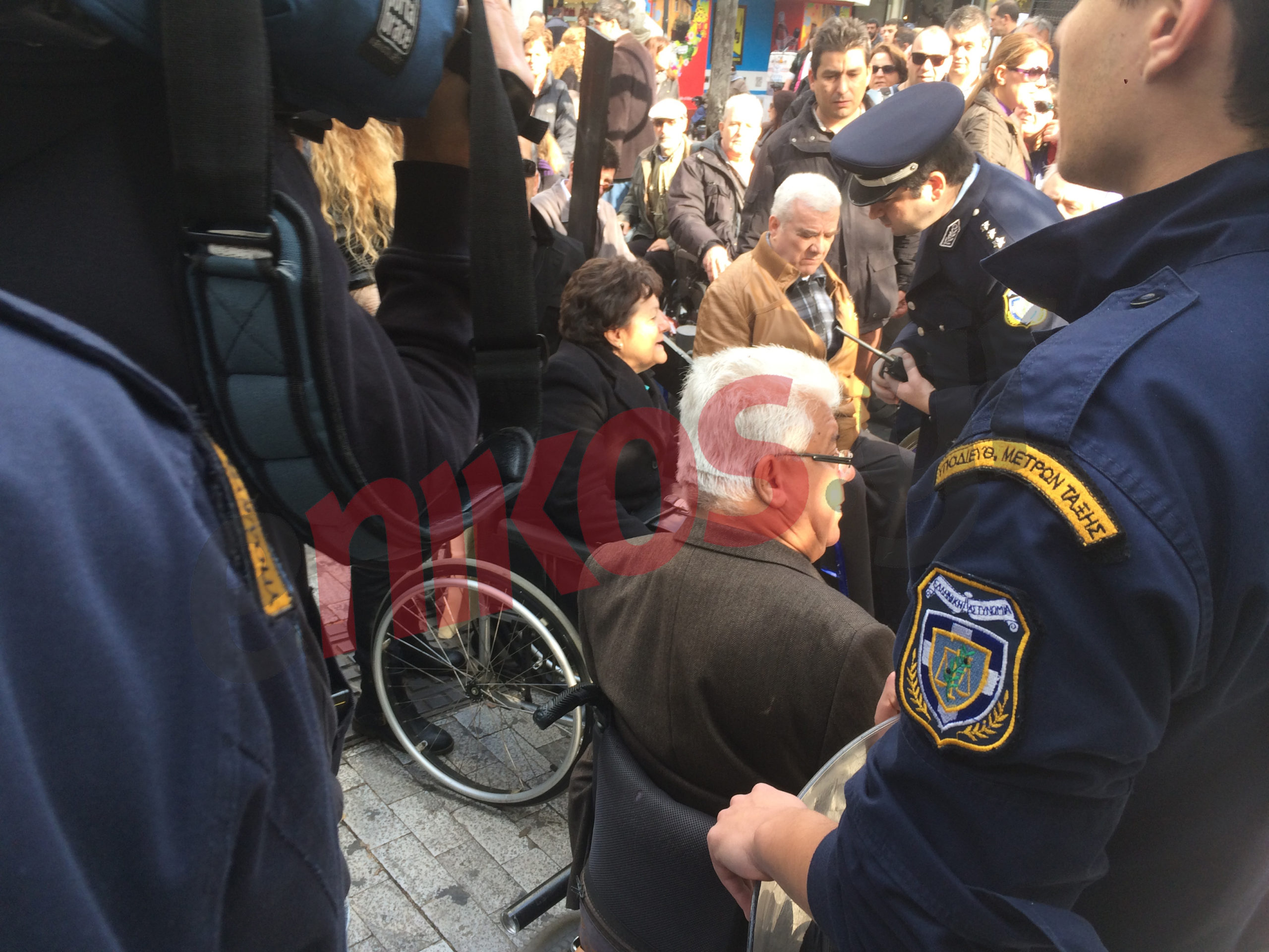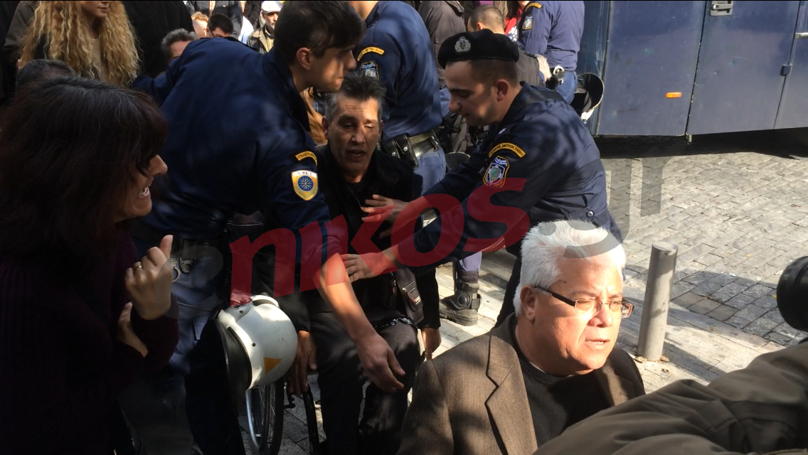 Οι αστυνομικοί έβαλαν τα πόδια τους στις ρόδες των αναπηρικών αμαξιδίων για να τους σταματήσουν ενώ παράλληλα, χρησιμοποίησαν και τις ασπίδες τους.