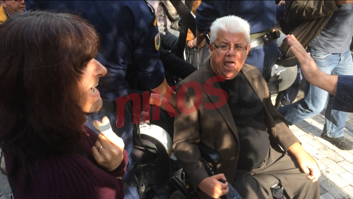 Η ένταση προκλήθηκε όταν άνδρες των ΜΑΤ δεν επέτρεψαν στα άτομα με αναπηρία που κάνουν πορεία να προσεγγίσουν το Υπουργείο Οικονομικών.