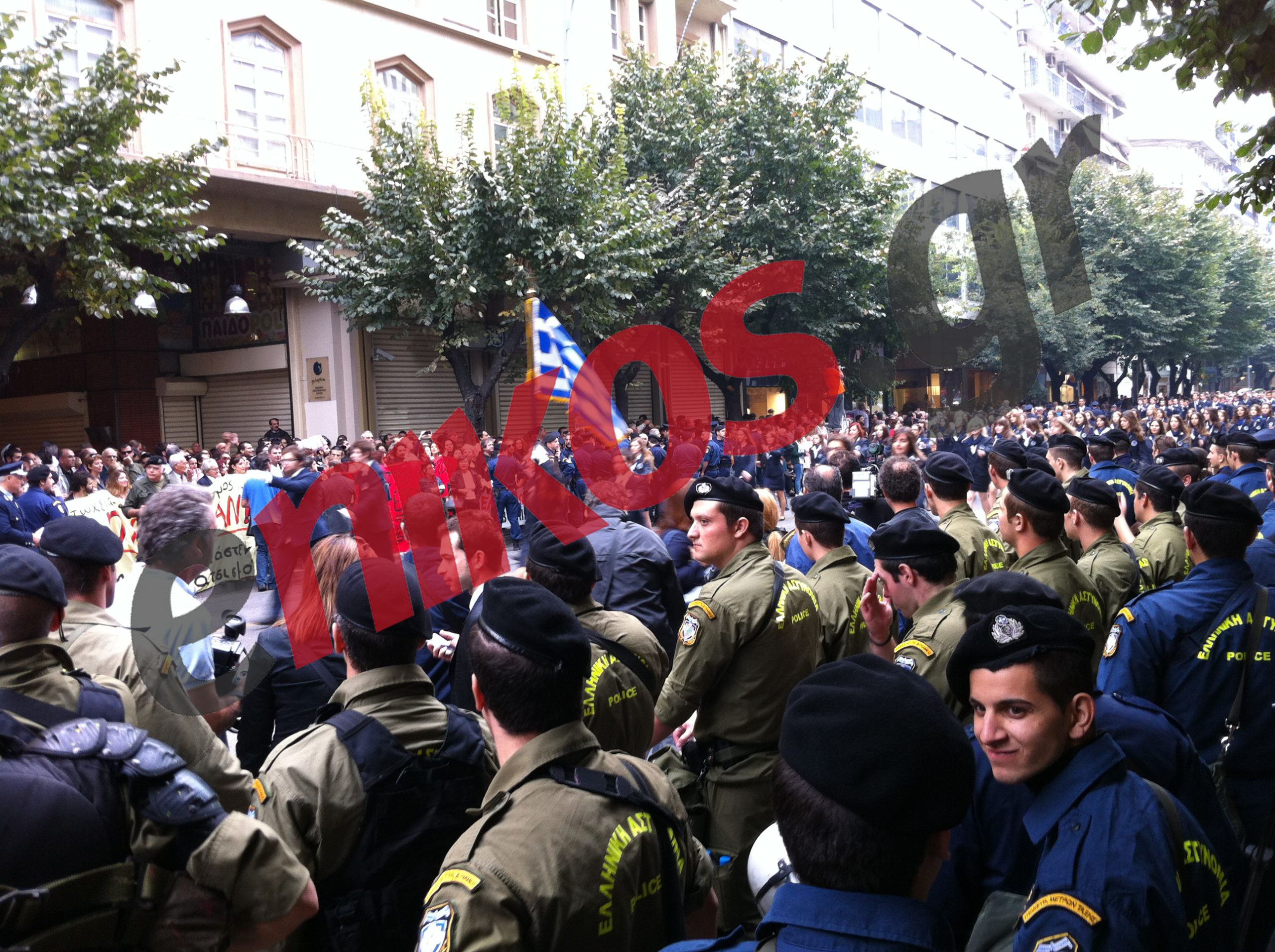 Πλήθος αστυνομικών “παρακολουθεί” την μαθητική παρέλαση στην Θεσσαλονίκη. Η παρέλαση εξελίχθηκε και ολοκληρώθηκε ομαλά.