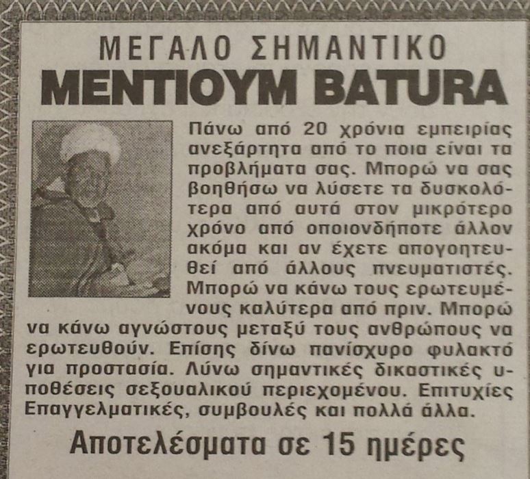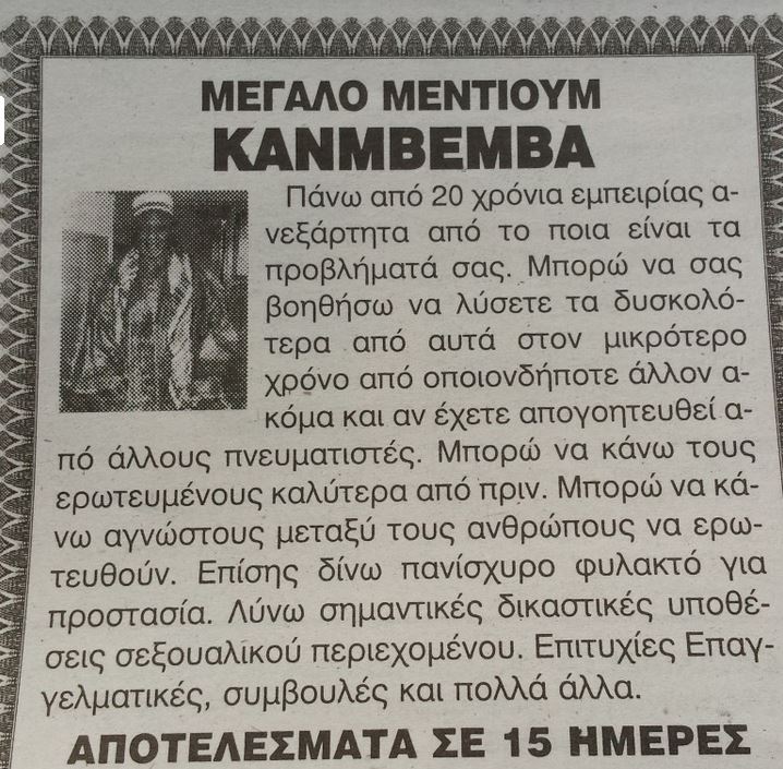 «Πάνω από 20 χρόνια εμπειρίας, ανεξάρτητα από ποια είναι τα προβλήματά σας. Μπορώ να σας βοηθήσω να λύσετε τα δυσκολότερα από αυτά, στο μικρότερο χρόνο από οποιονδήποτε άλλον, ακόμα και αν έχετε απογοητευτεί από άλλους πνευματιστές. Μπορώ να κάνω τους ερωτευμένους καλύτερα από πριν. Μπορώ να κάνω αγνώστους μεταξύ τους ανθρώπους να ερωτευθούν. Επίσης δίνω πανίσχυρο φυλακτό για προστασία. Λύνω σημαντικές δικαστικές υποθέσεις σεξουαλικού περιεχομένου. Επιτυχίες επαγγελματικές, συμβουλές και πολλά άλλα».