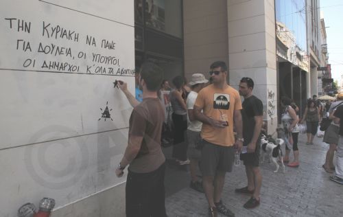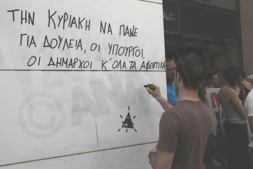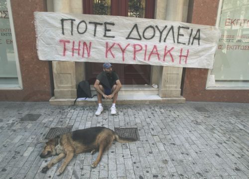 Την αντίδραση τους στη λειτουργία των καταστημάτων τις Κυριακές εξέφρασαν το πρωί διαδηλωτές, κρατώντας ένα πανό μπροστά σε ανοιχτό εμπορικό κατάστημα στην οδό Ερμού.
