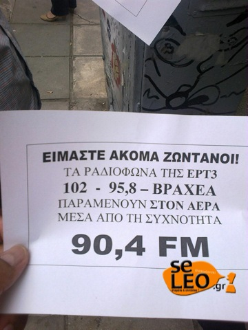 Οι σταθμοί 102 και 95,8 συνεχίζουν να εκπέμπουν στον 90,4 FM σύμφωνα με το έντυπο υλικό που μοίρασαν οι εργαζόμενοι στους διαδηλωτές κατά τη διάρκεια συγκέντρωσης για την ΕΡΤ.