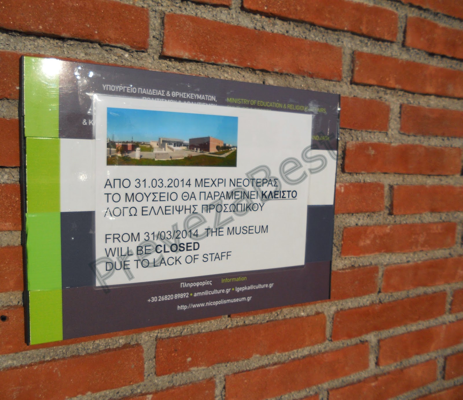 Αυτή την στιγμή η αρχαιολογική υπηρεσία της Πρέβεζας καταγράφει 20 τουλάχιστον ελλείψεις σε προσωπικό. Λίγο πριν την έναρξη της τουριστικής περιόδου ο τρόπος που η πολιτεία αντιμετωπίζει την πολιτιστική μας κληρονομιά αποτυπώνεται στις δύο πινακίδες που τοποθετήθηκαν στο αρχαιολογικό μουσείο της Νικόπολης και οι οποίες πληροφορούν τους επισκέπτες στα ελληνικά και στα αγγλικά ότι το Μουσείο θα παραμείνει κλειστό μέχρι νεοτέρας.