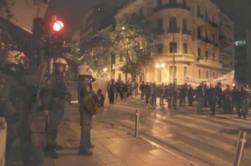 Άνδρες των ΜΑΤ μπροστά από την Νομική Σχολή Αθηνών όπου περνούν φοιτητές φωνάζοντας συνθήματα κατά τη διάρκεια της πορείας διαμαρτυρίας για τον αποκλεισμό της Νομικής από αστυνομικές δυνάμεις.